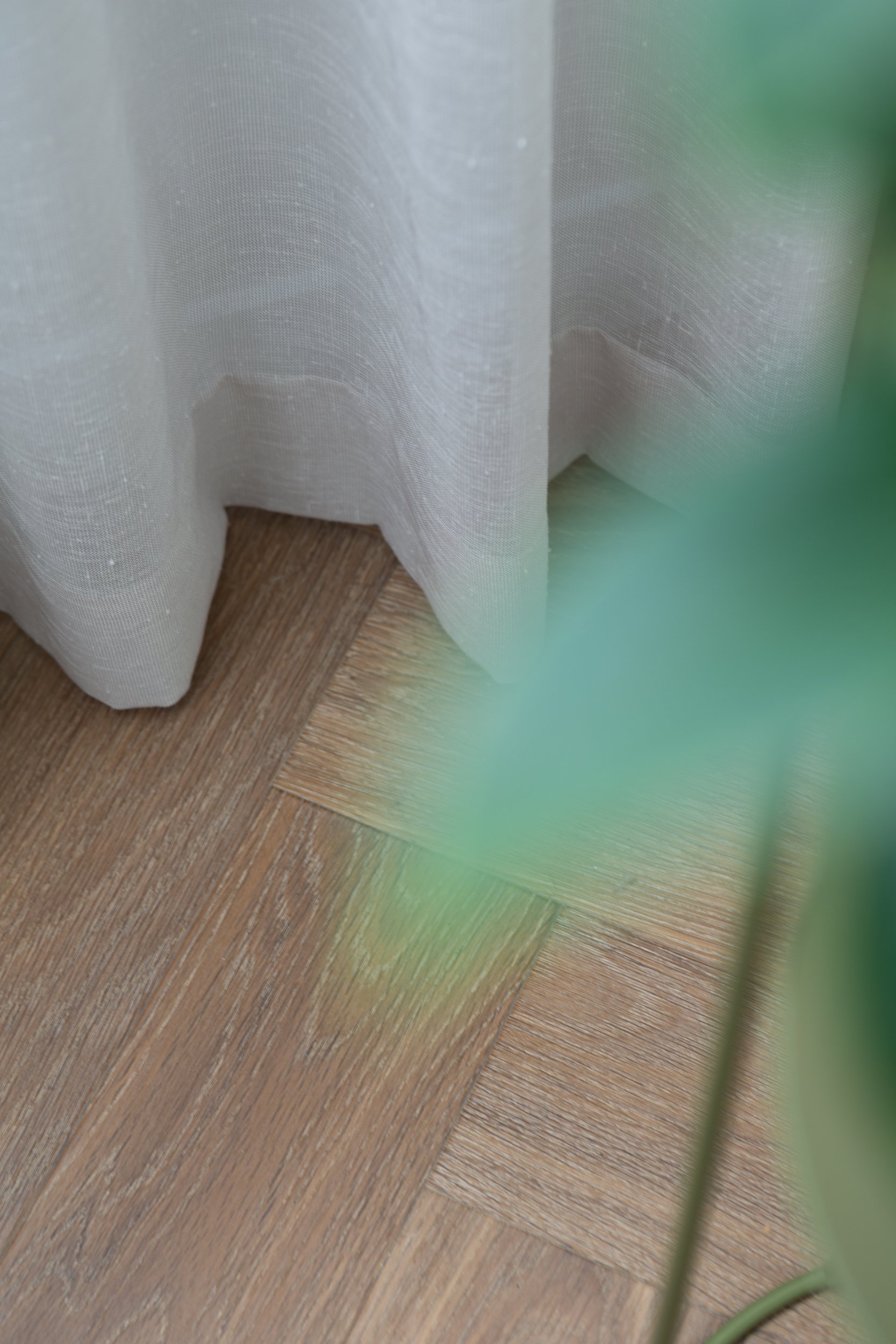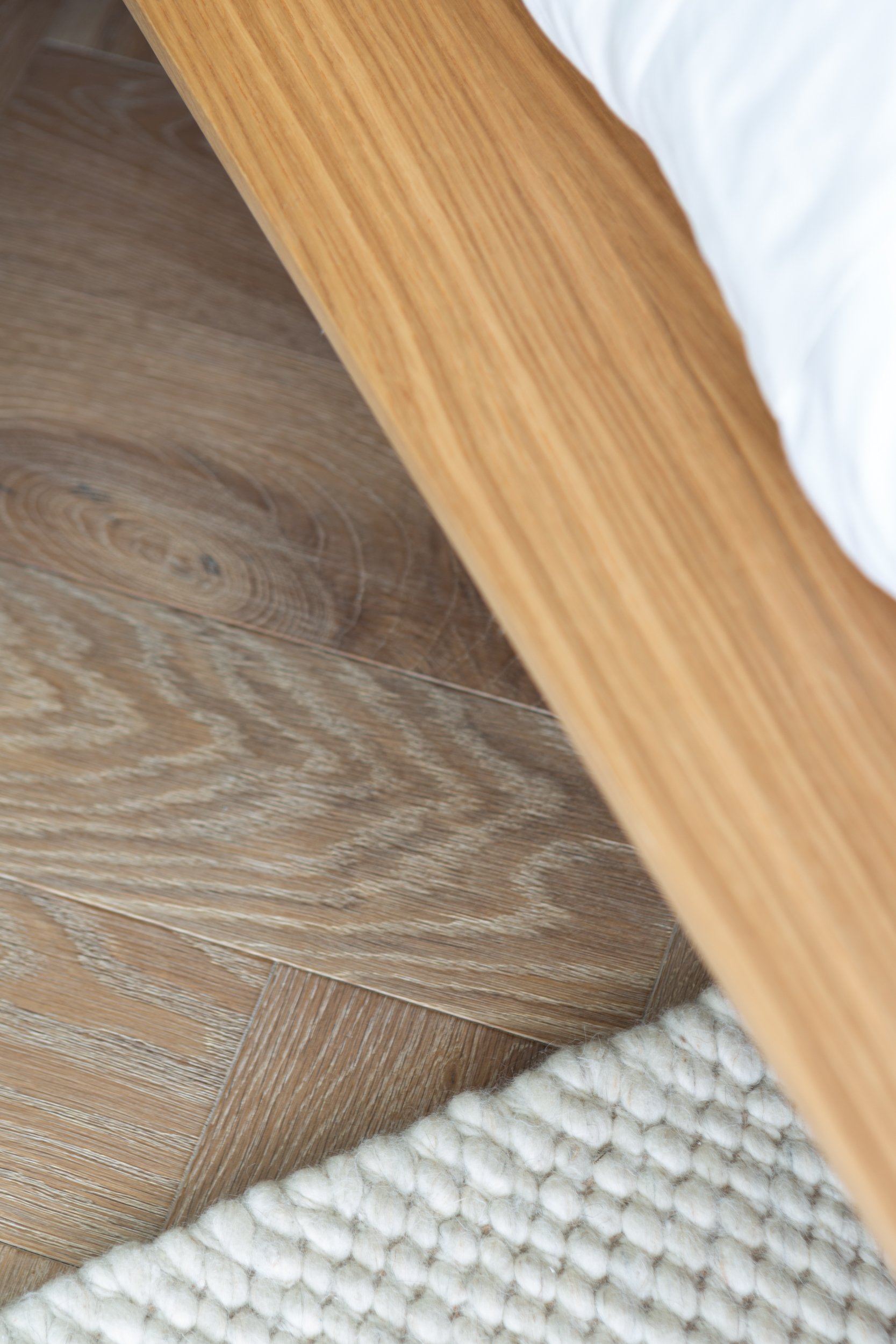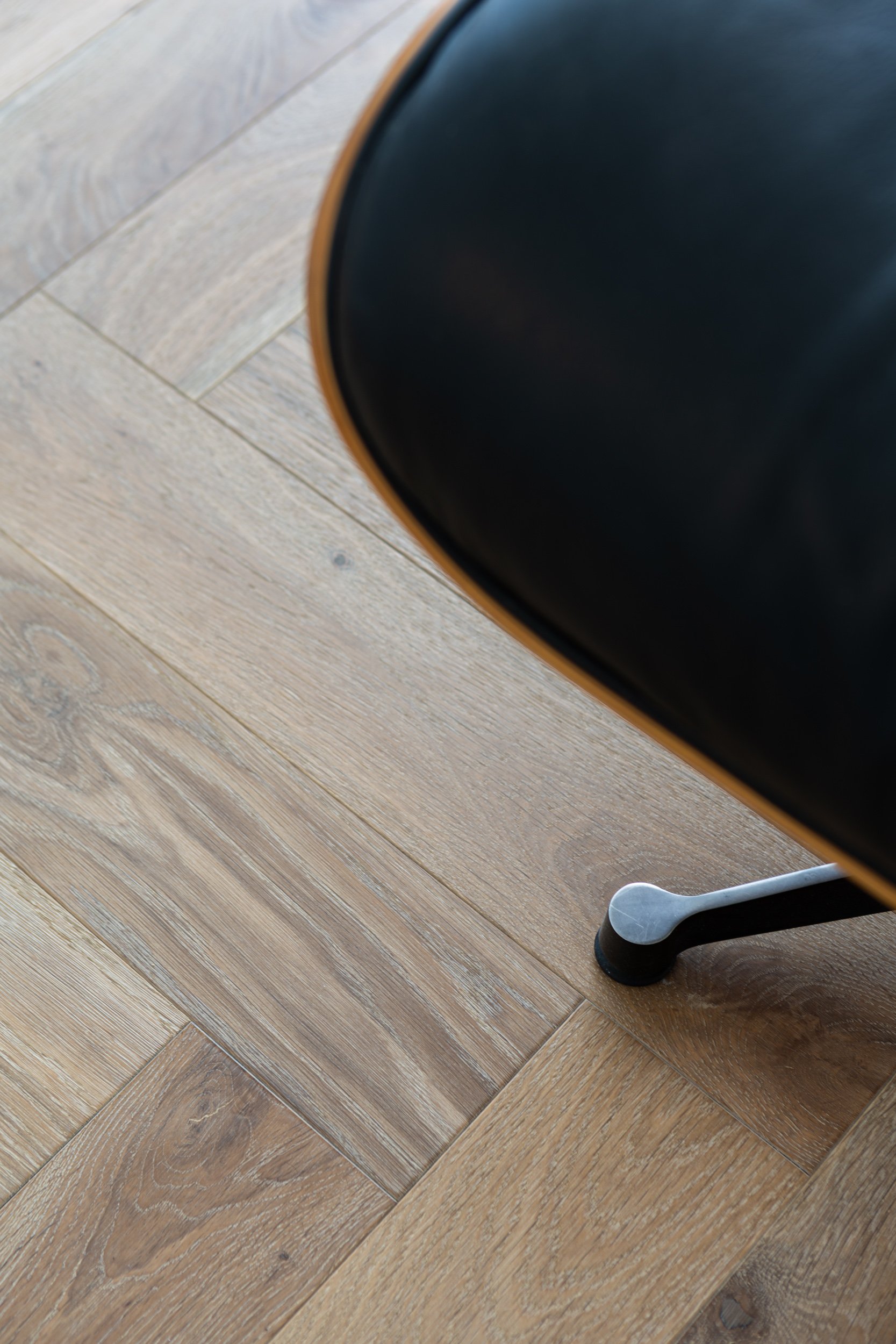 Vermont oak flooring infuses a rustic sophistication into this Attadale home when showcased in a charming herringbone pattern.