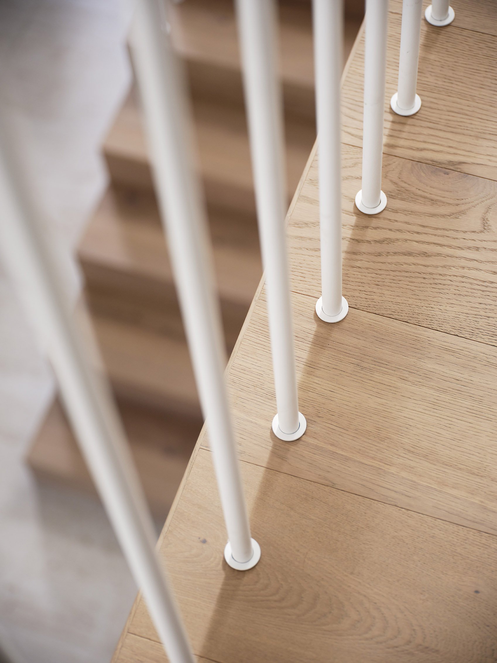 Snowdrop flooring by Coswick features through the upper level and staircase, adding a warm and inviting touch to the space and complementing the light, airy design.