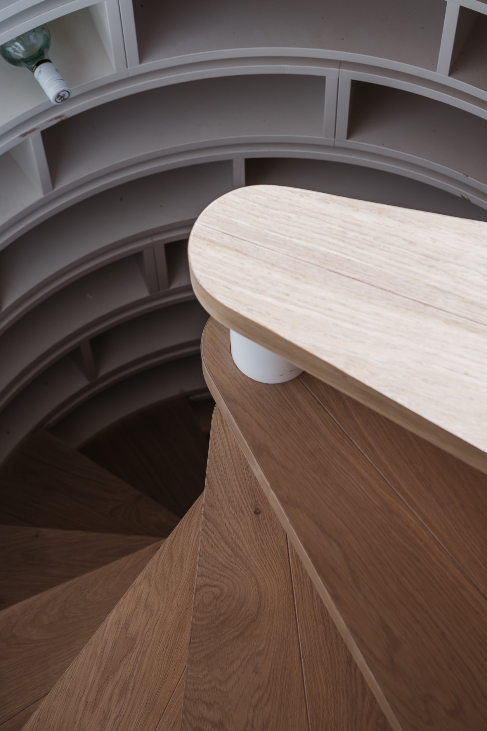 This project features a spiralling wine cellar staircase in the heart of the living space where each step was crafted and built by hand, shout out to Ben from Touch of Class Flooring for his amazing handiwork.