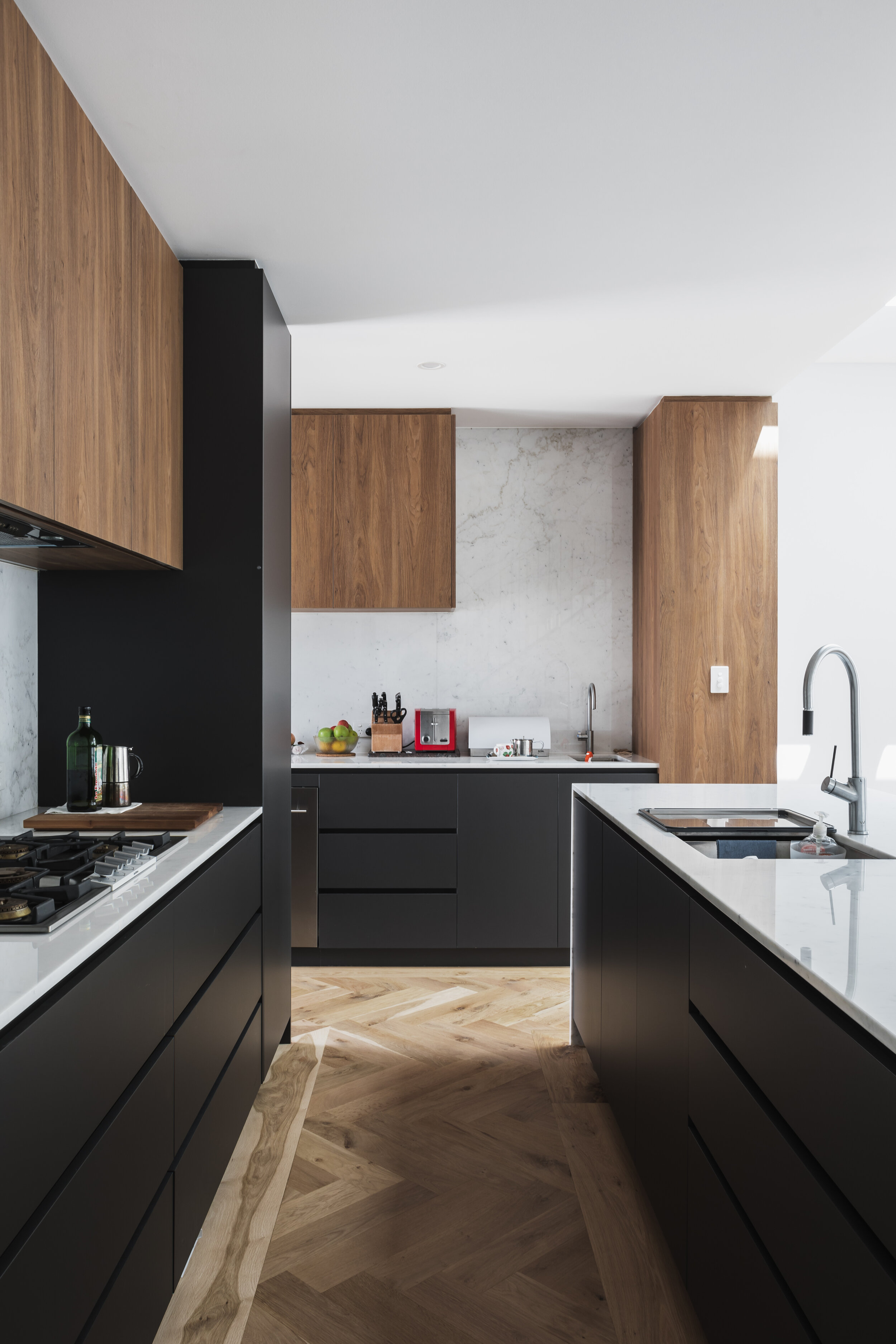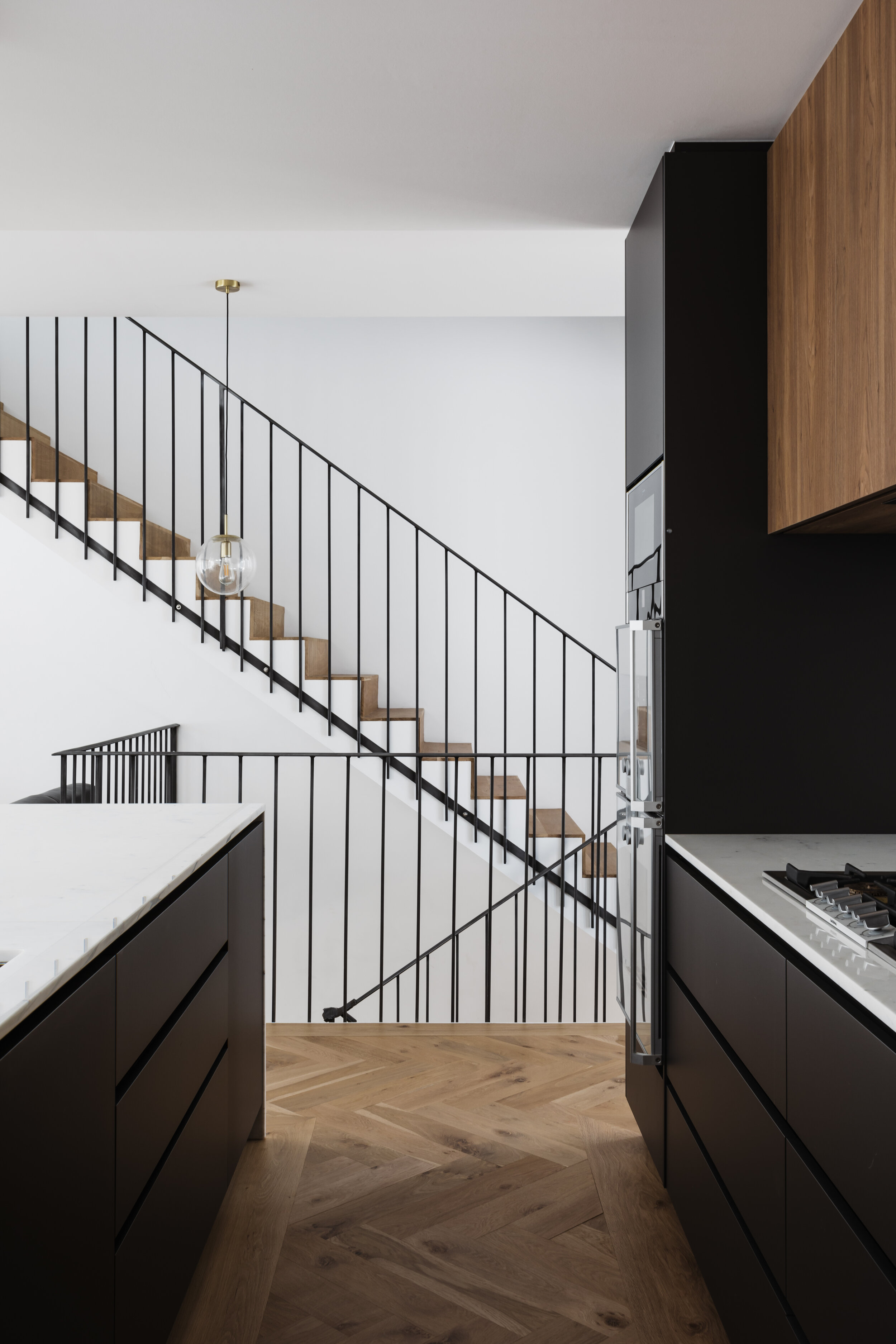 Sunlight streams through the expansive windows, bathing the herringbone oak floors in a golden glow that enhances their rich grain and adds an inviting warmth to the spacious kitchen.