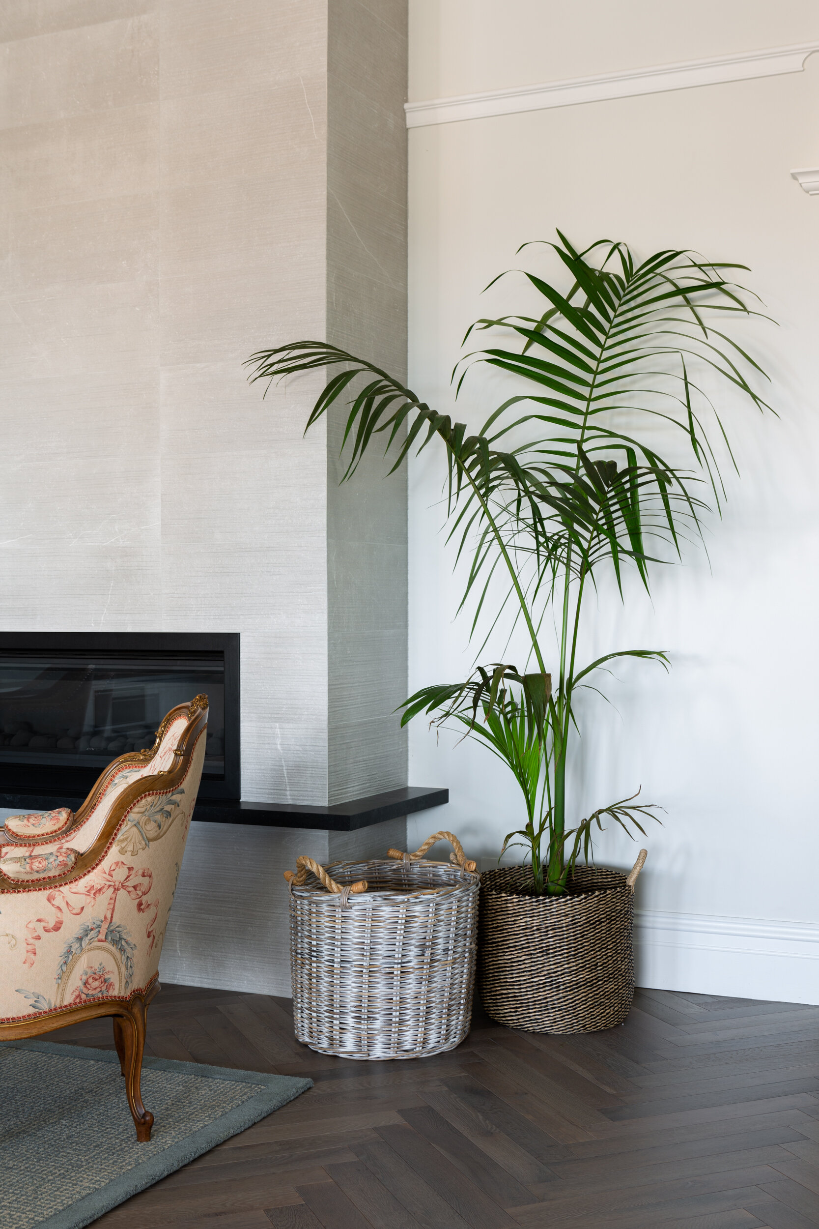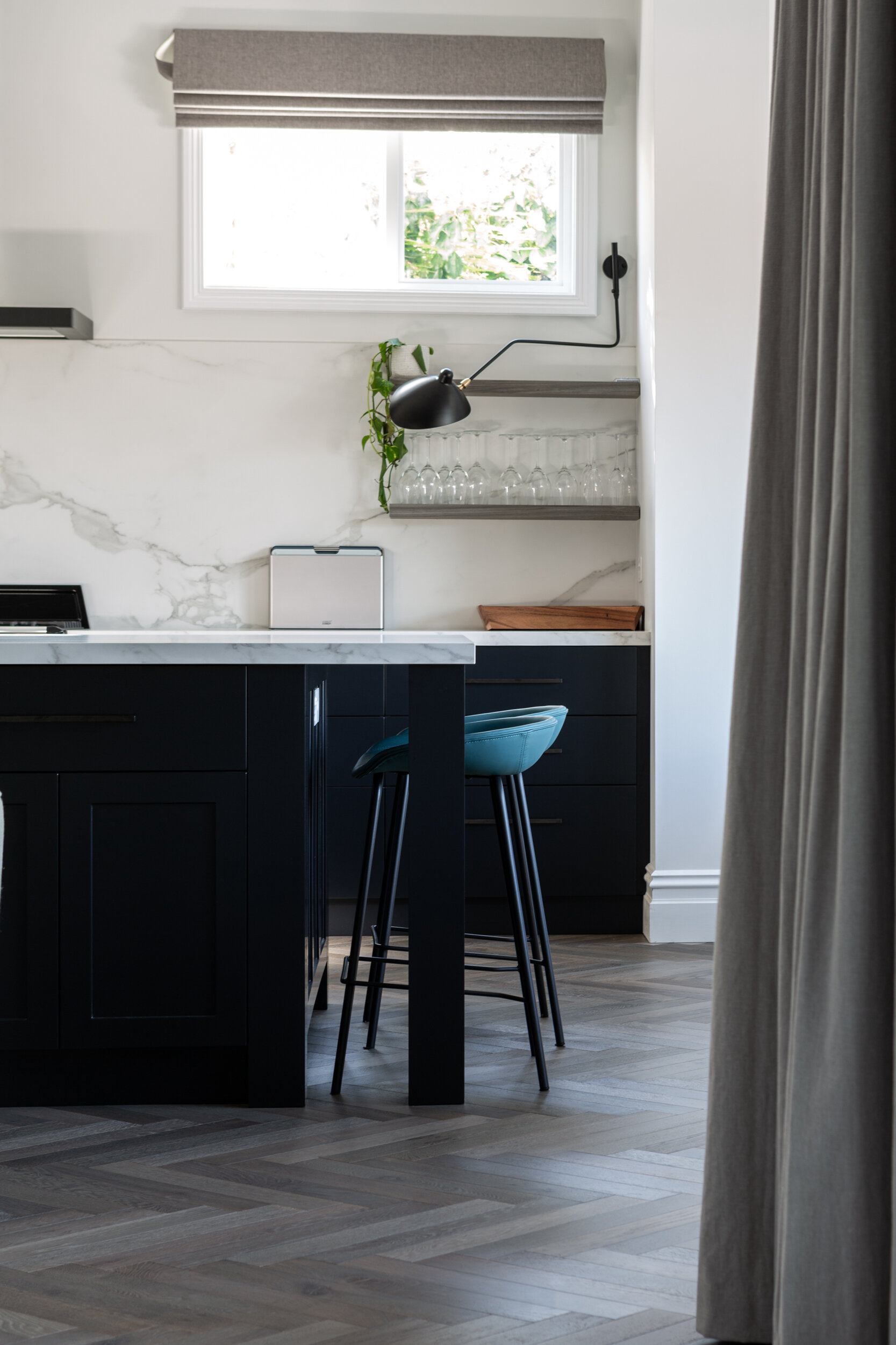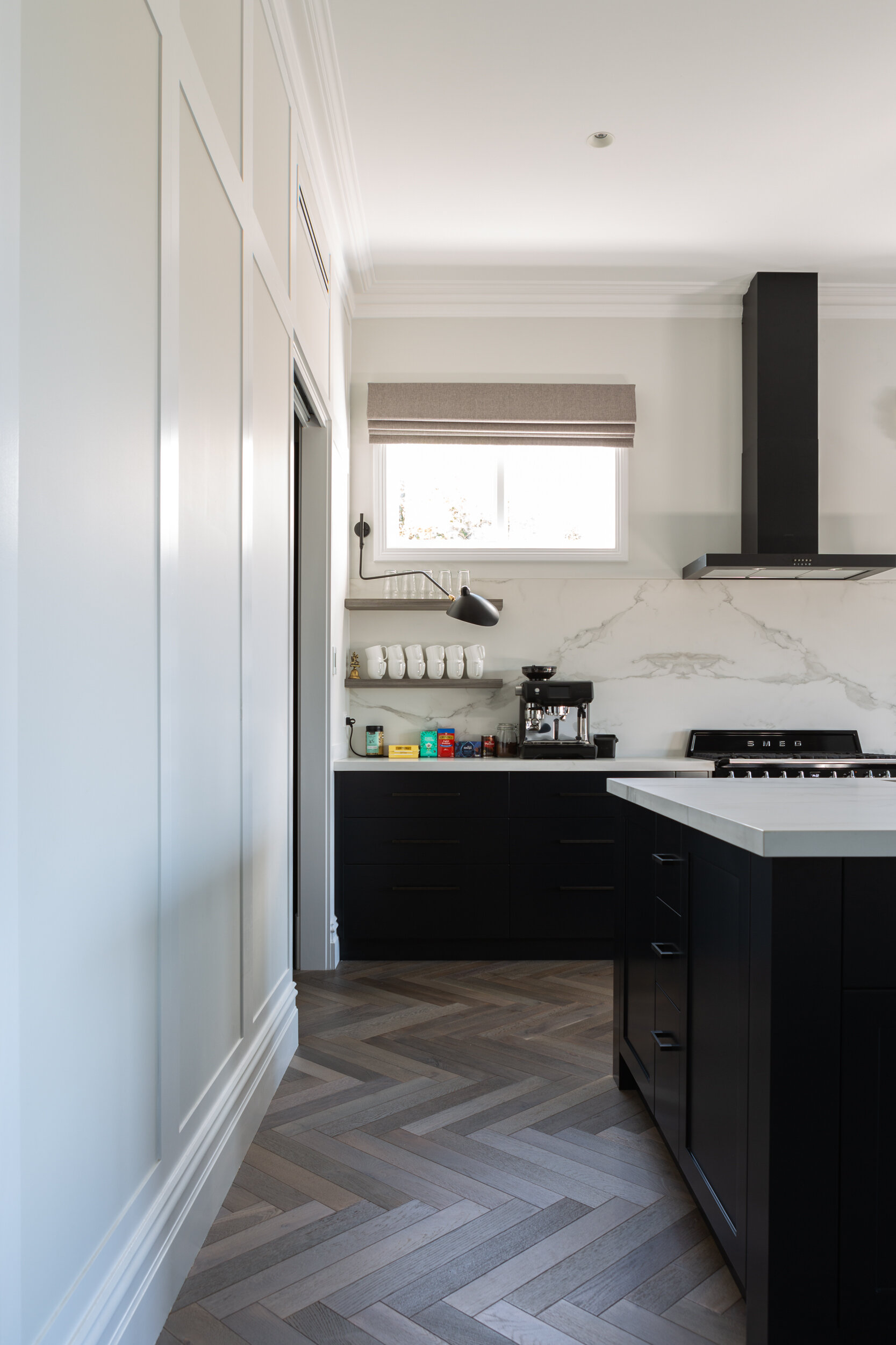 Here, Moondance is crafted in a made to order Herringbone pattern. The elegant flow of the wood grain highlighted by its pearly grey shades and subtle beige undertones, brings a bright luminosity to this Claremont home.