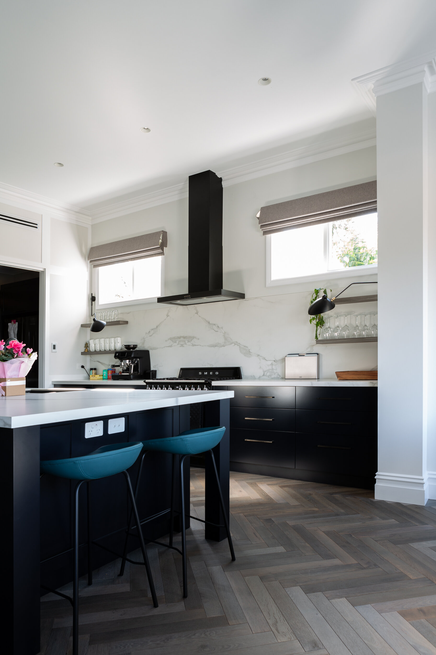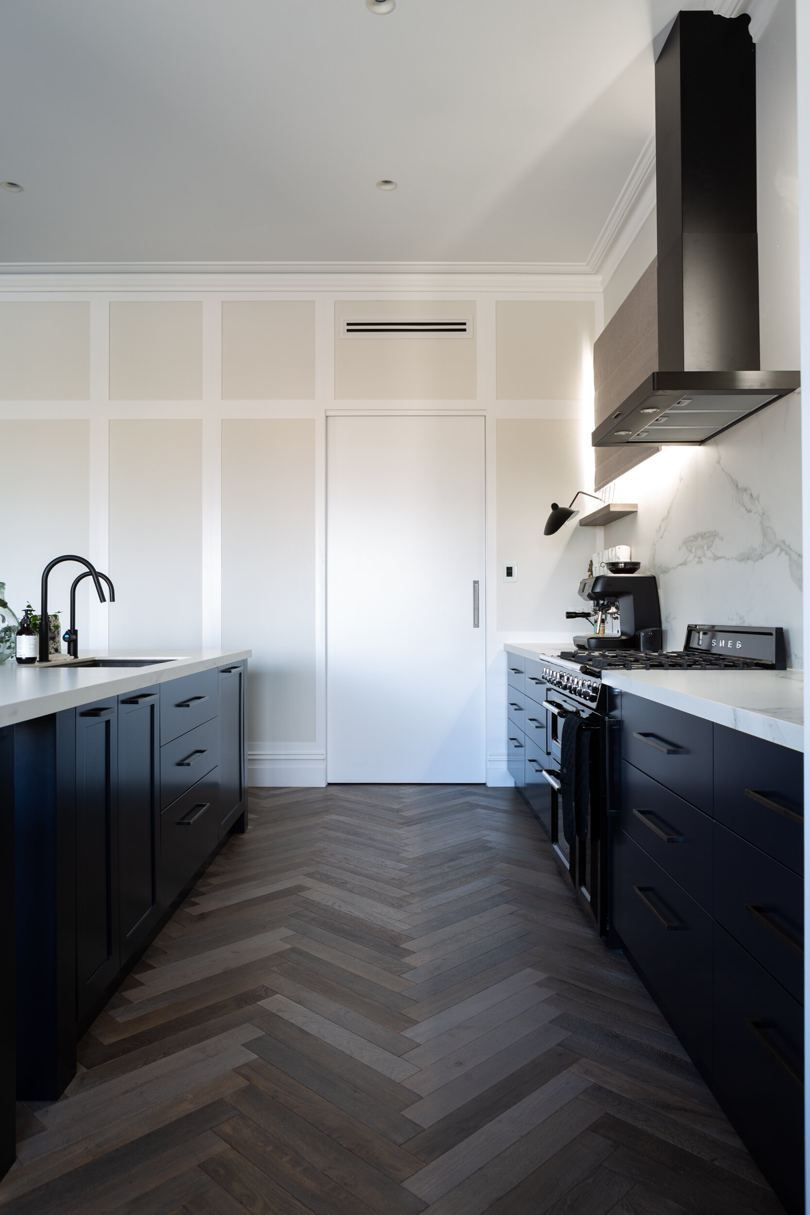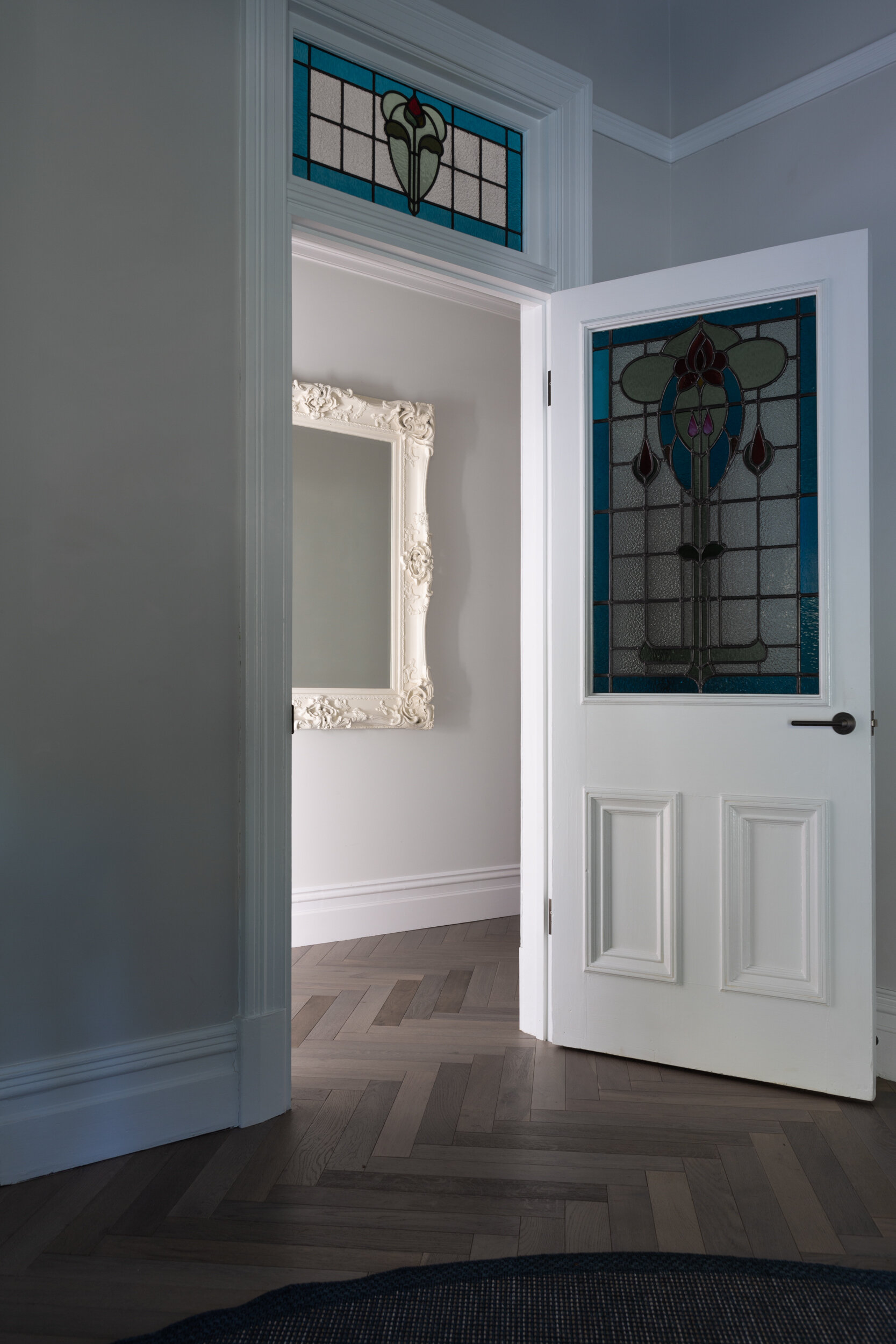 Here, Moondance is crafted in a made to order Herringbone pattern. The elegant flow of the wood grain highlighted by its pearly grey shades and subtle beige undertones, brings a bright luminosity to this Claremont home.