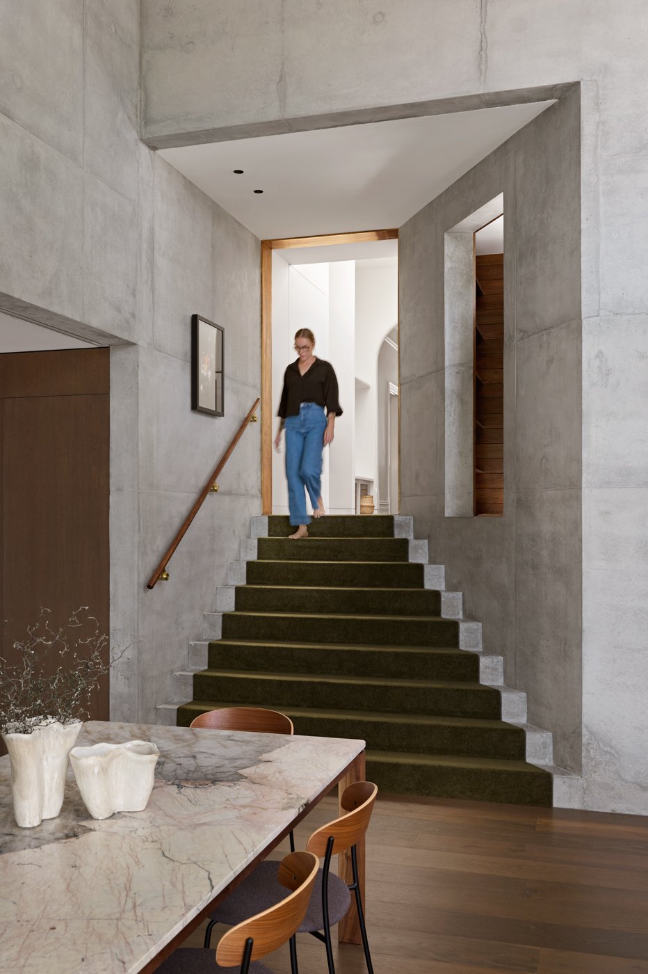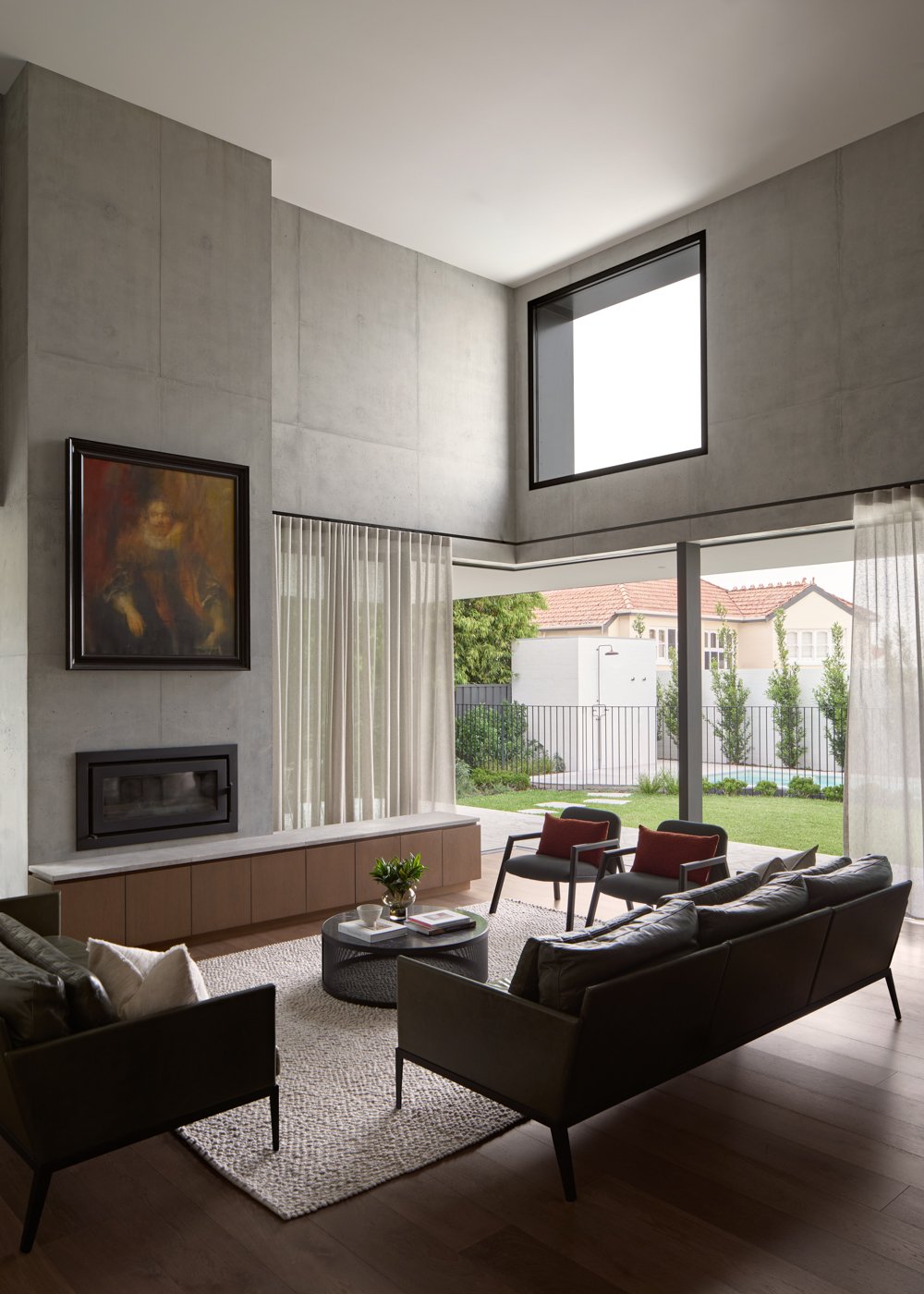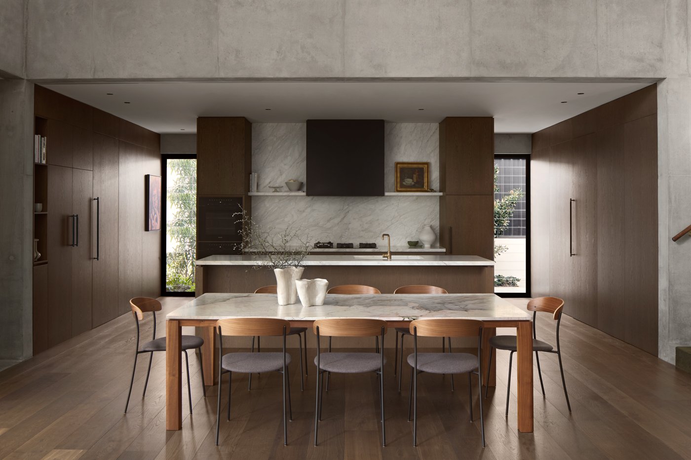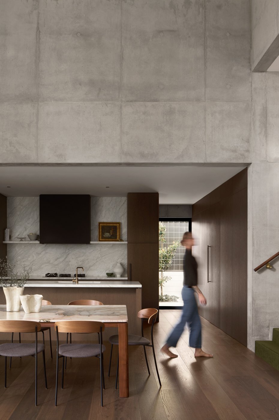 The predominate use of structural concrete is offset by Walnut oak flooring, wall lining and cabinetry, which gives a warmth to the spaces and is complemented by rich marble benches and surfaces.