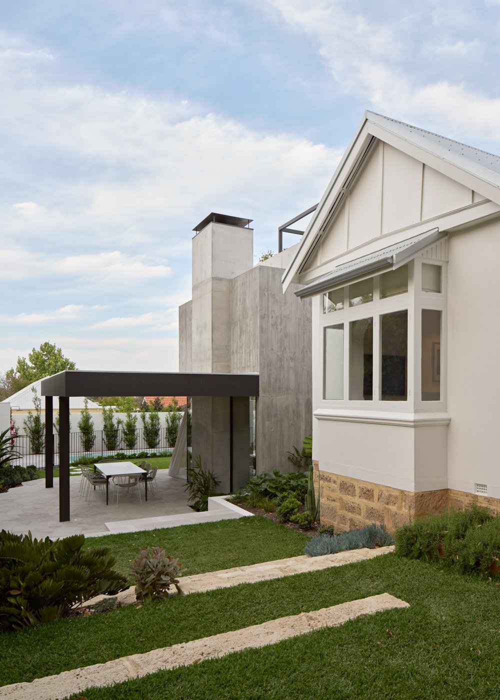 A substantial contemporary architectural addition to an existing federation house in Claremont.
