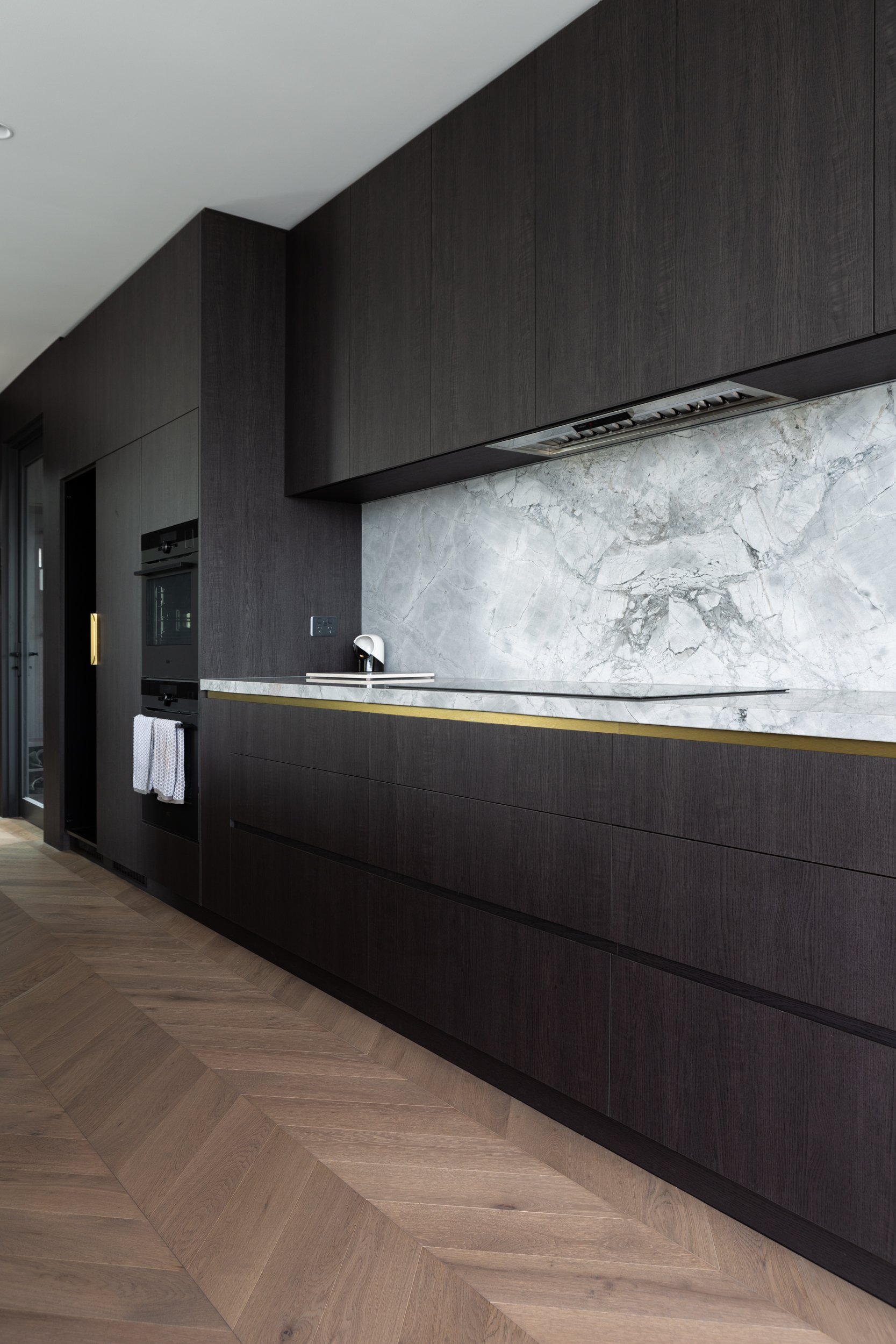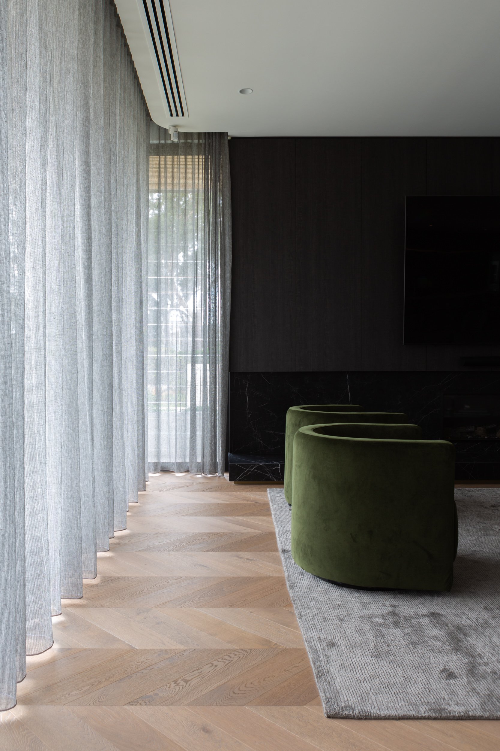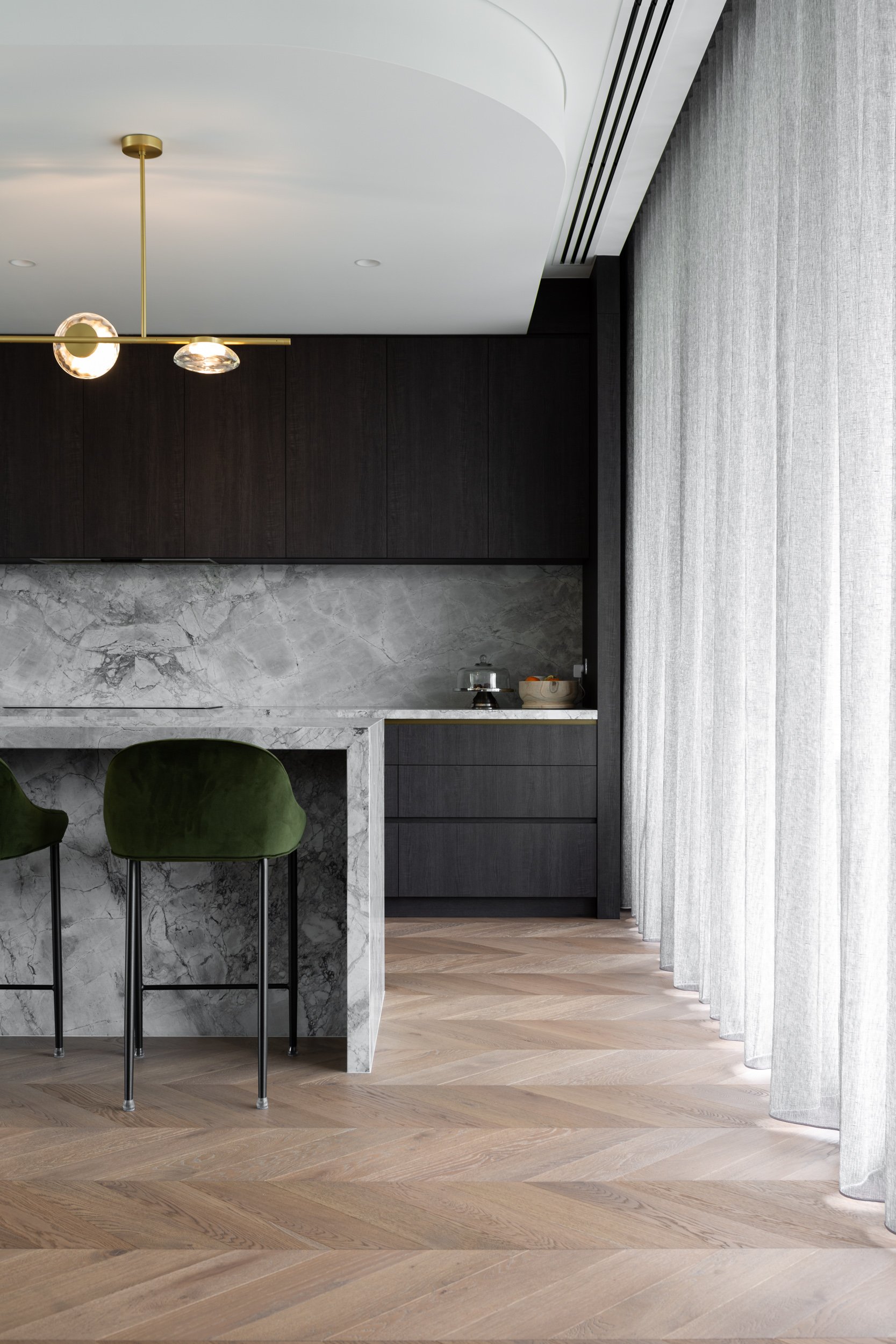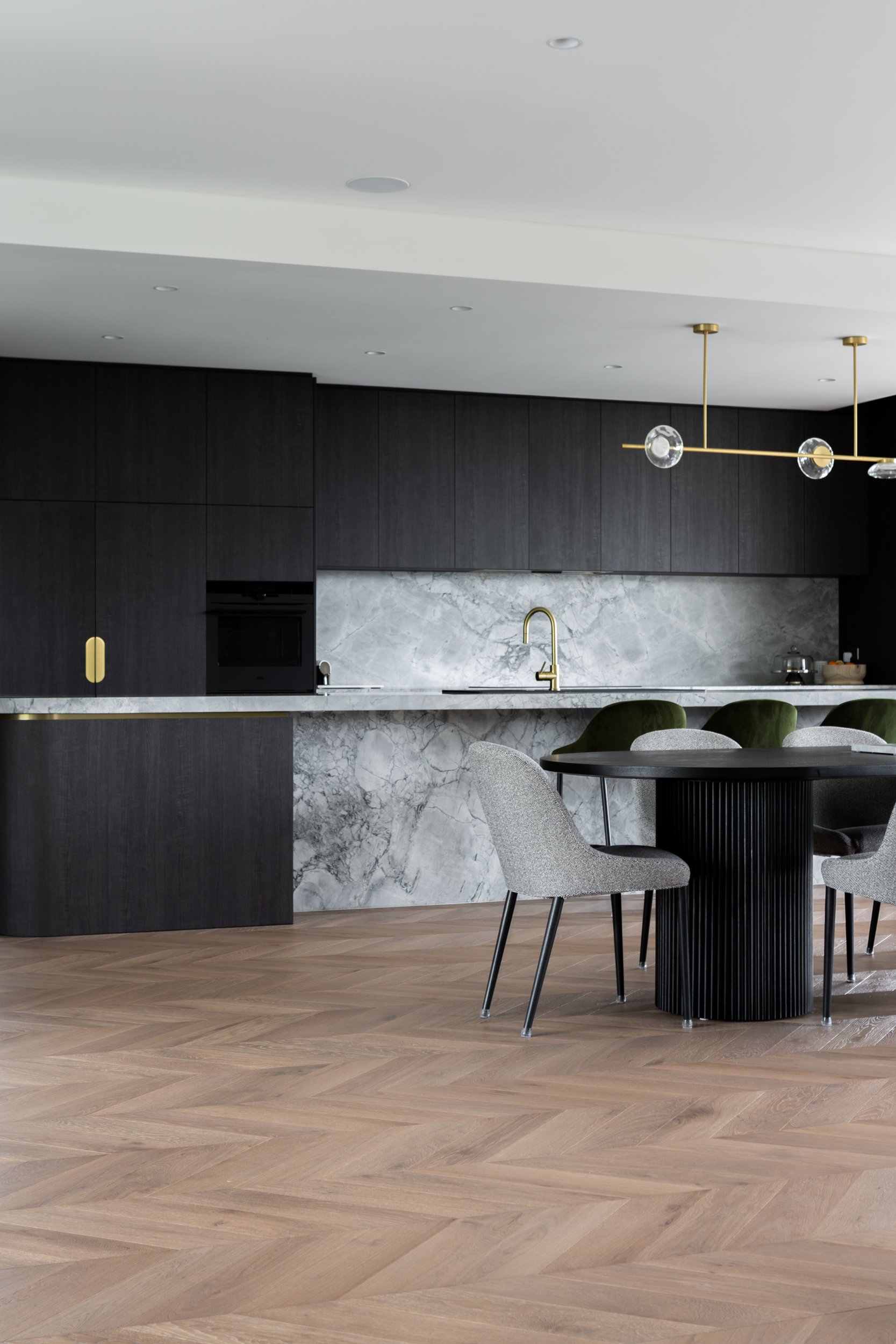 "We preferred the classic sharp lines of the chevron pattern over the herringbone, to complement the buildings architecture" says owner and builder Michael Little.