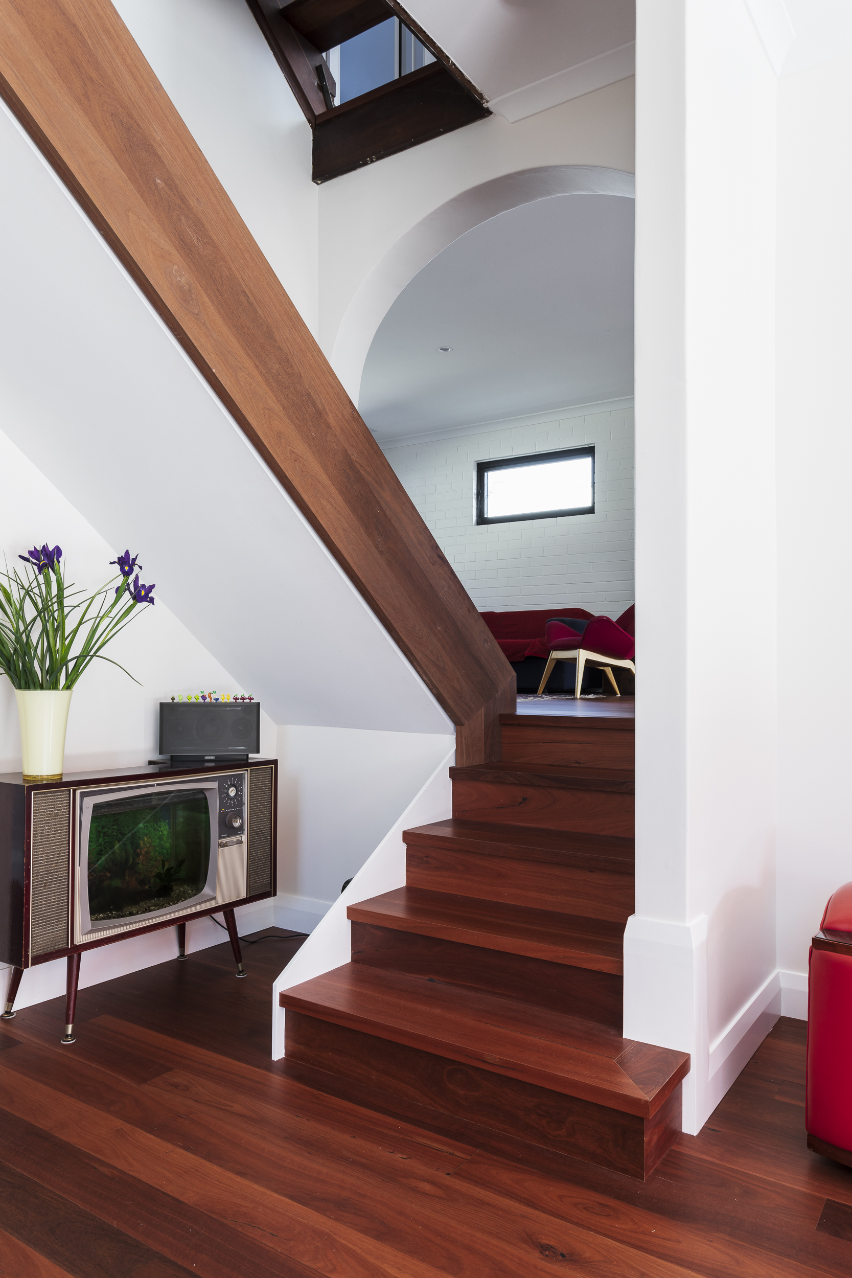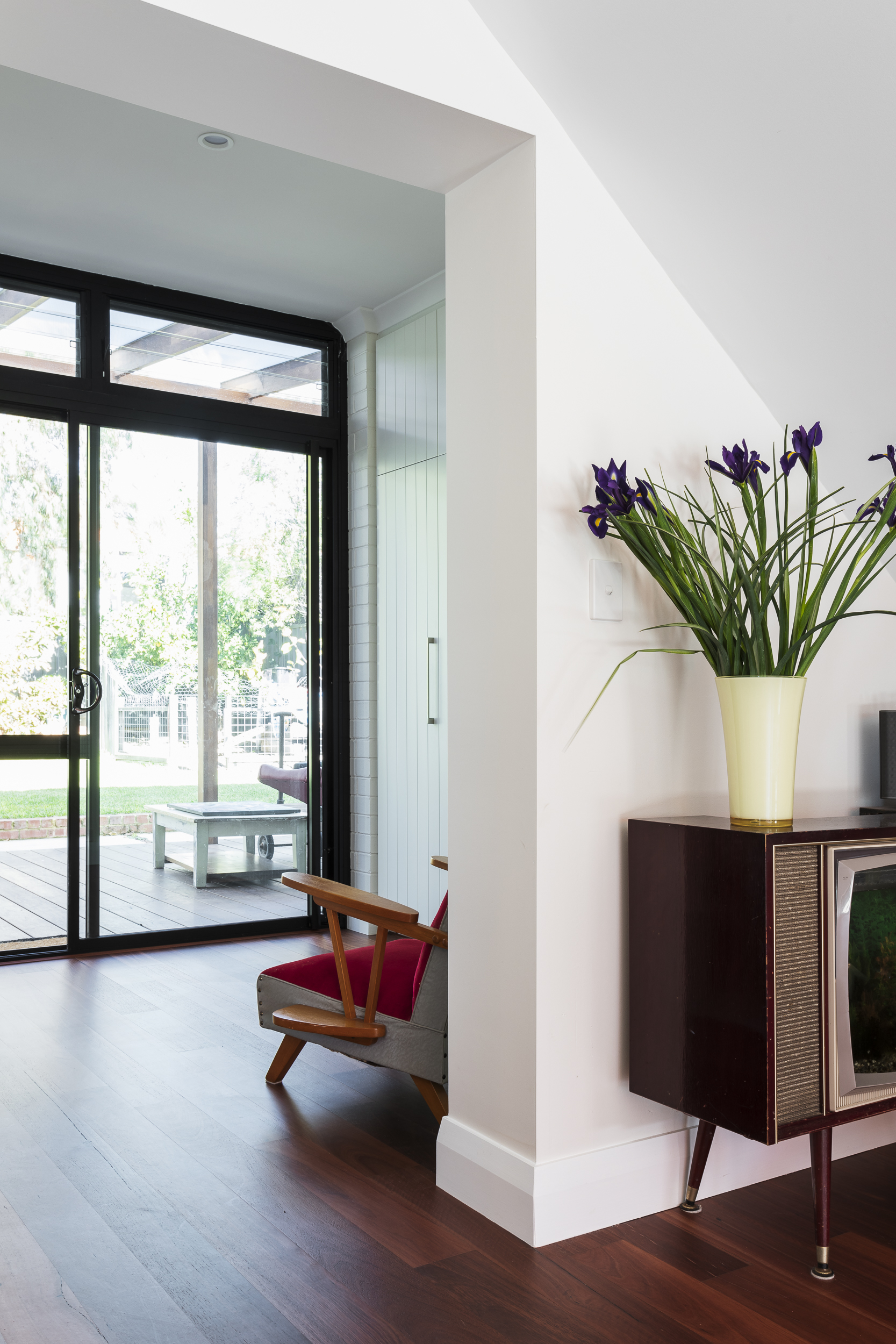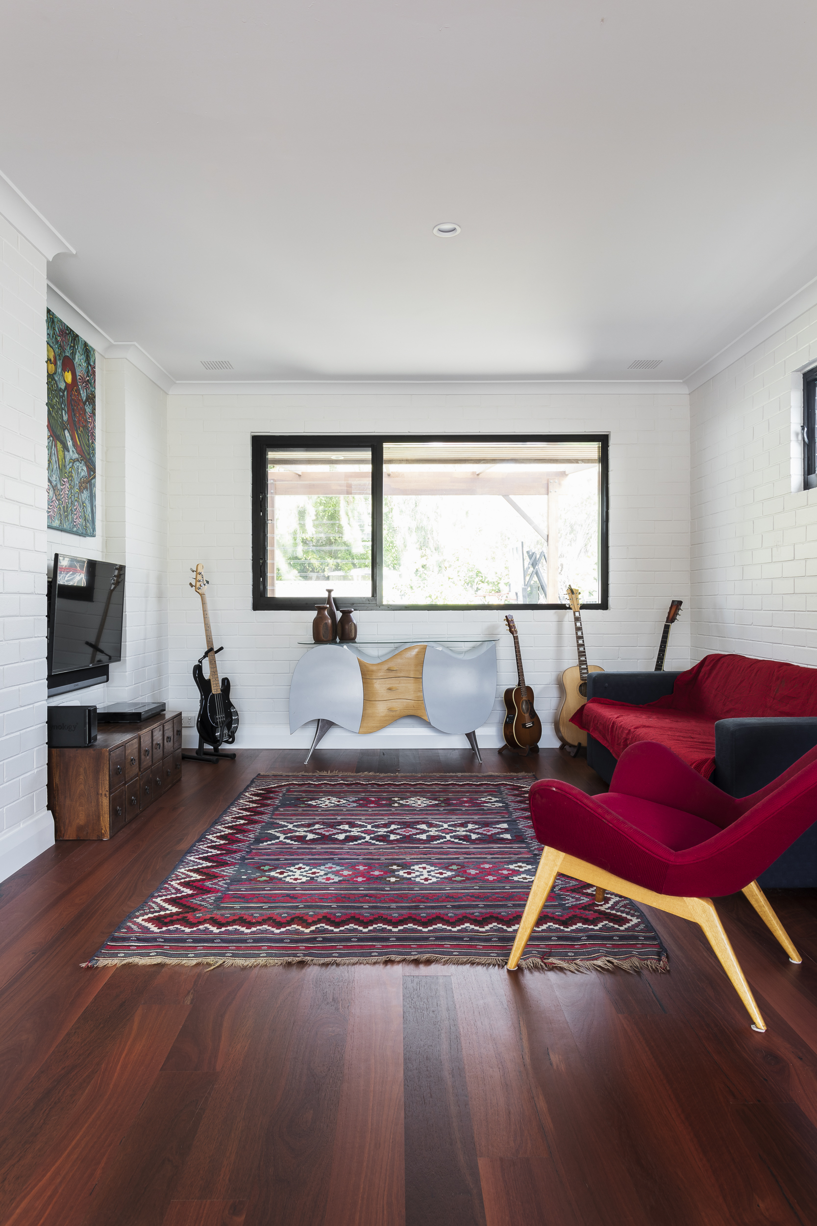 Jarrah finds a cozy spot amidst the retro decor and musical instruments, perfectly complementing the eclectic character of this Cottesloe home.
