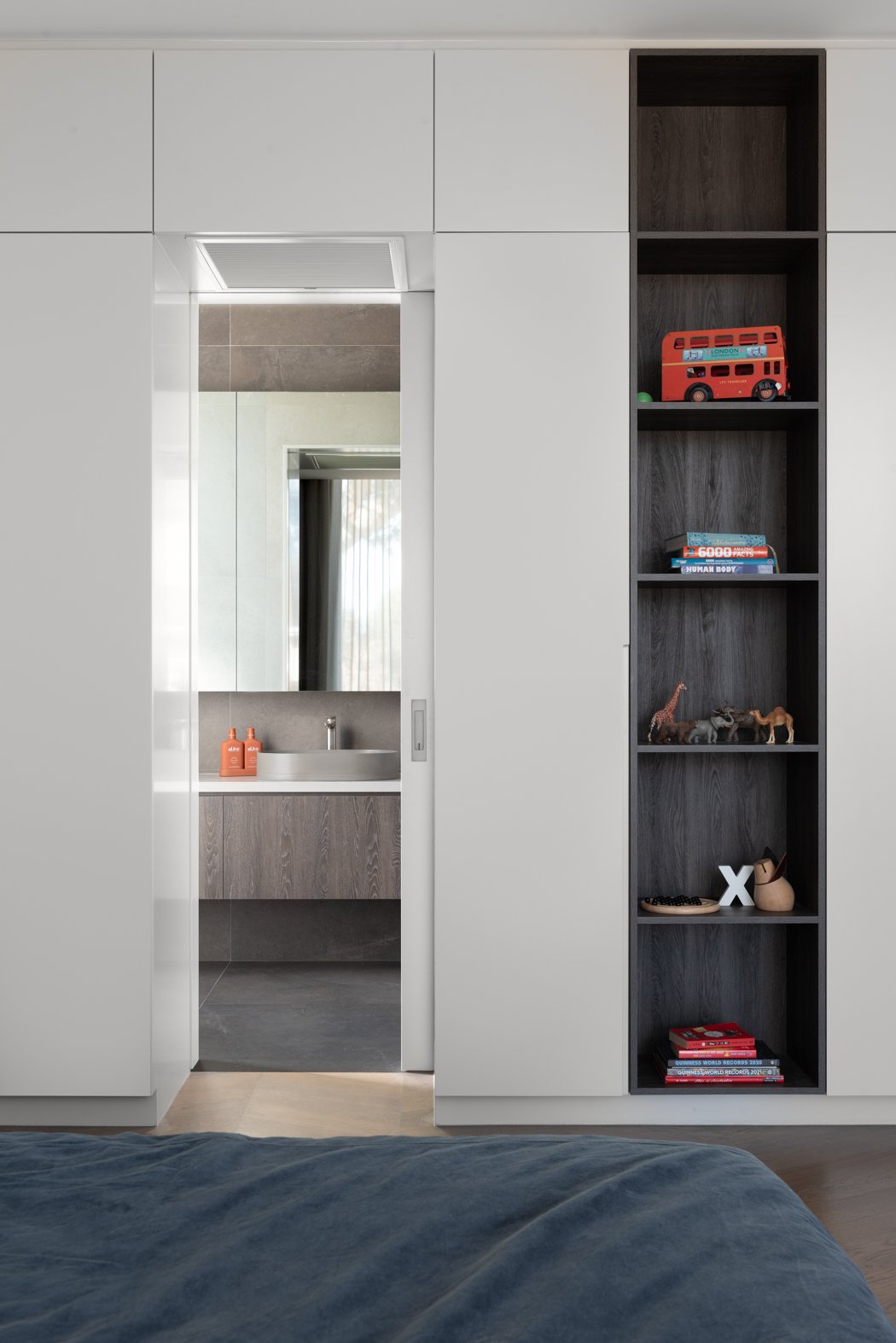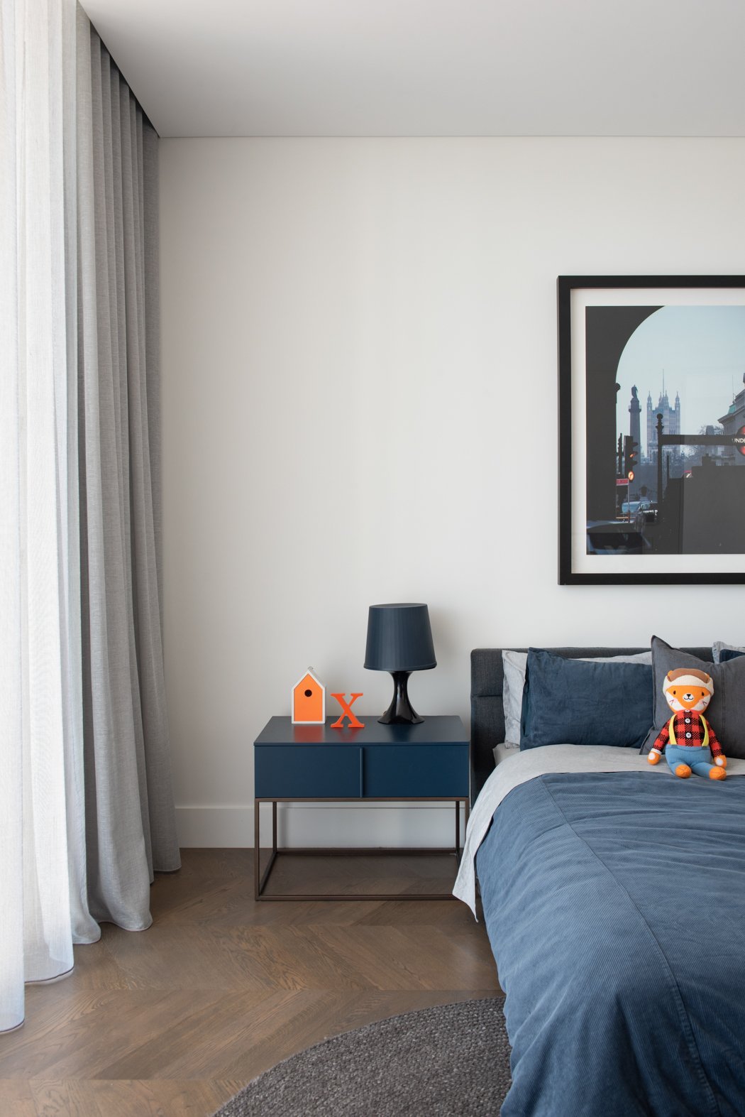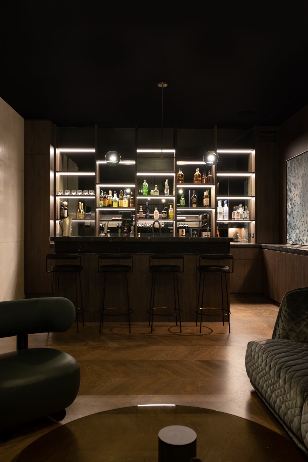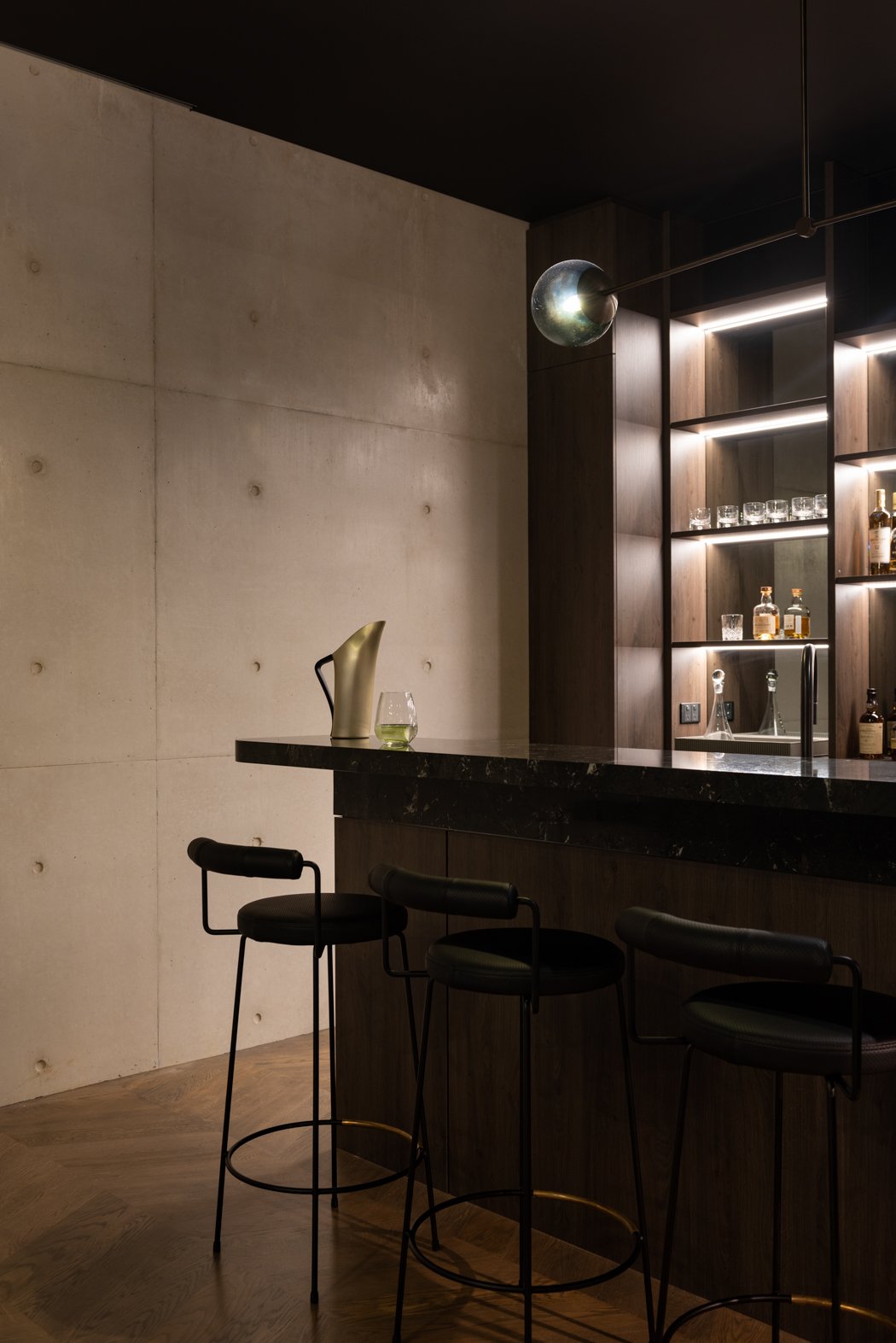 The design incorporates high ceilings and minimalist aesthetics, enhancing the feeling of lightness and airiness throughout the home. The use of solid oak herringbone flooring adds warmth and texture, grounding the contemporary design elements.