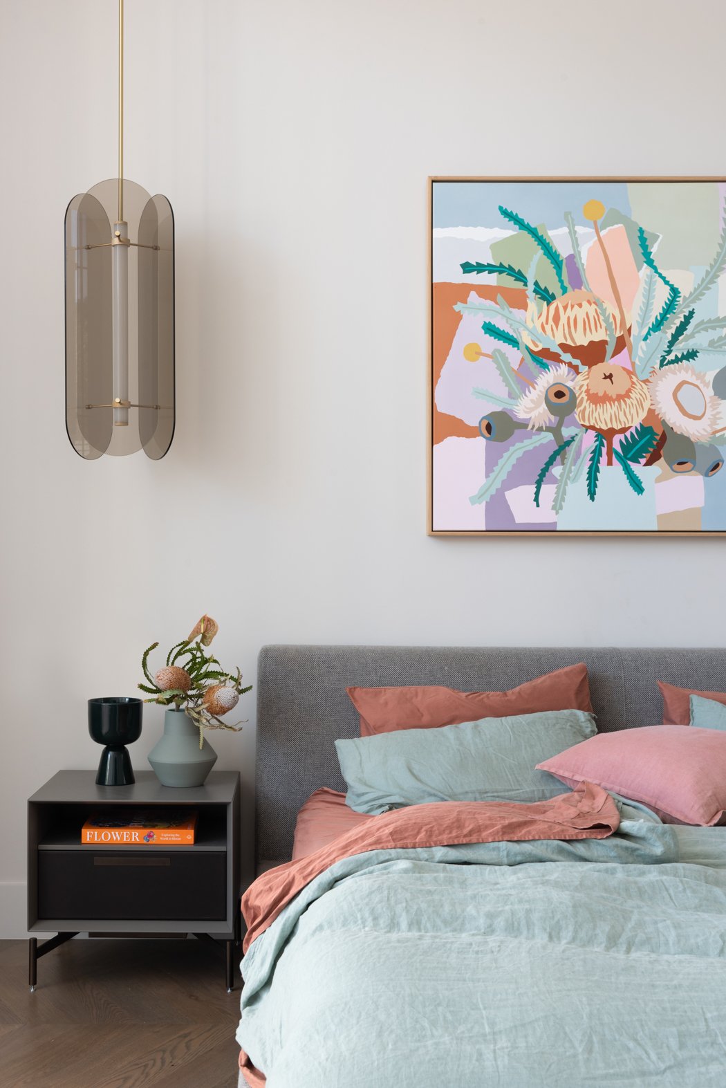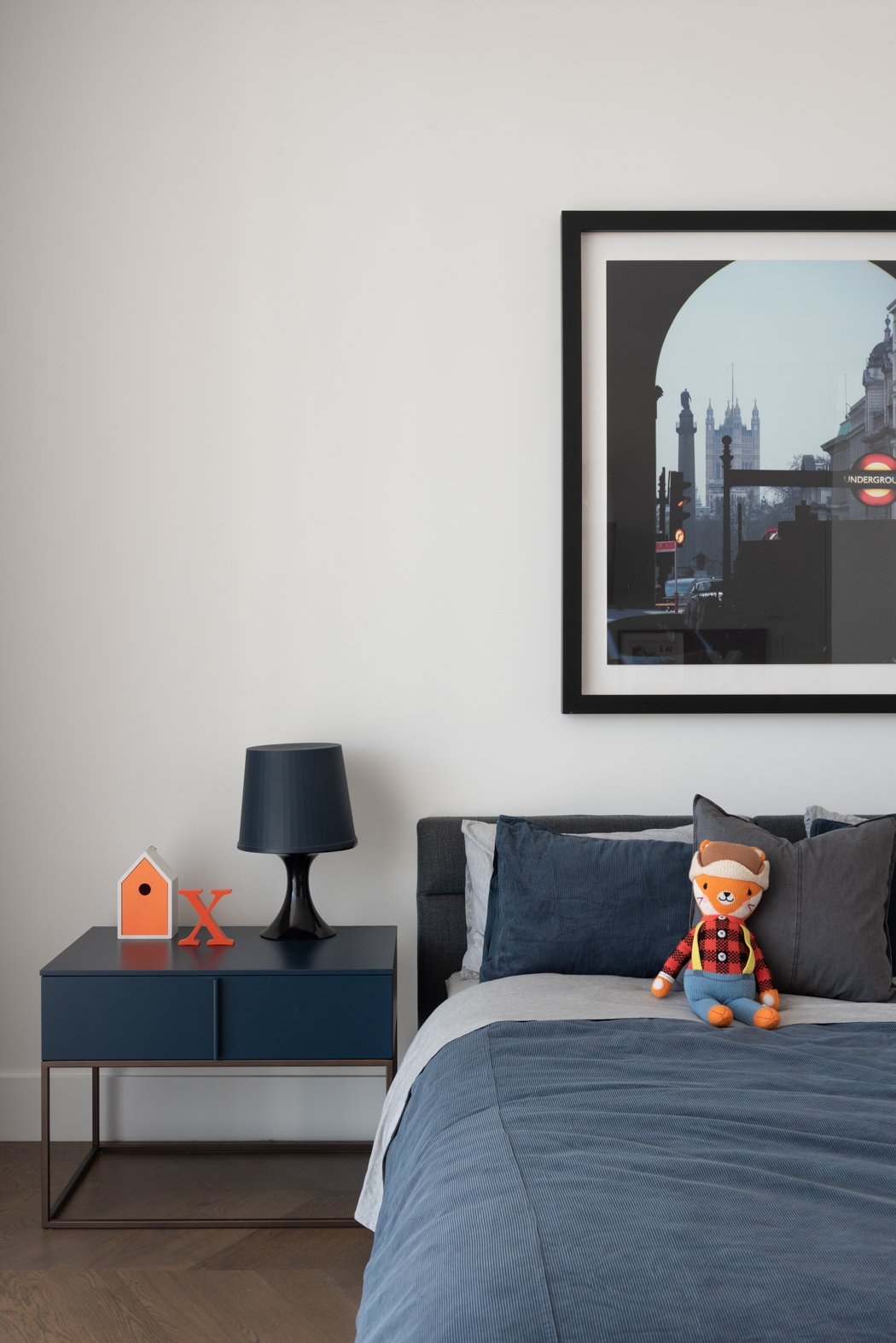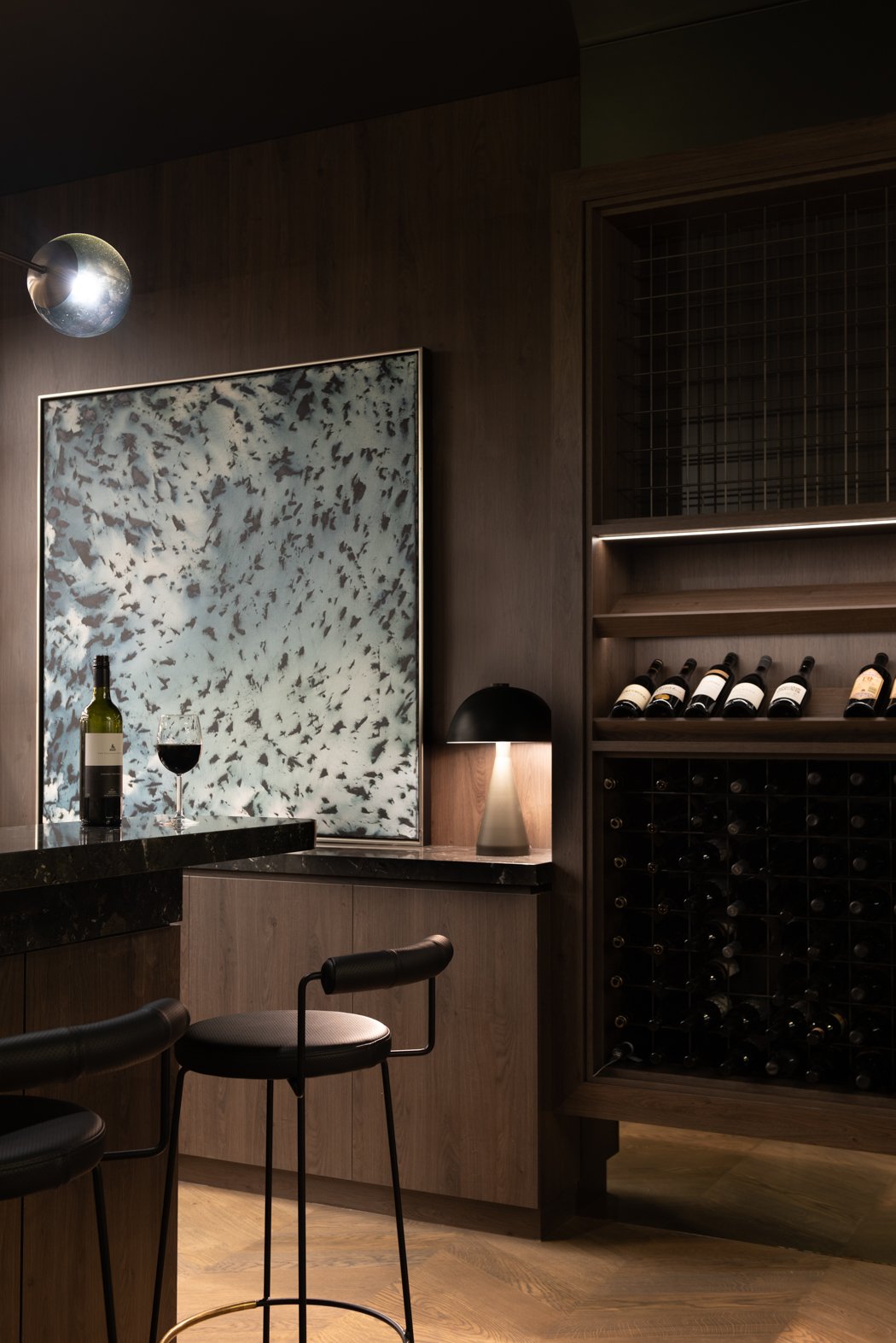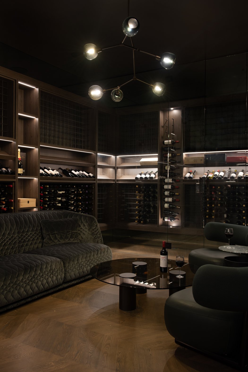 The design incorporates high ceilings and minimalist aesthetics, enhancing the feeling of lightness and airiness throughout the home. The use of solid oak herringbone flooring adds warmth and texture, grounding the contemporary design elements.