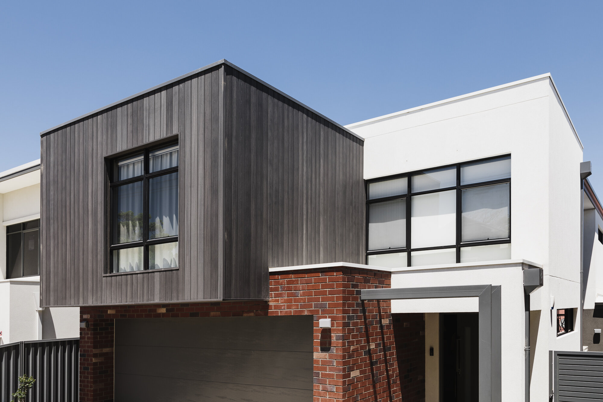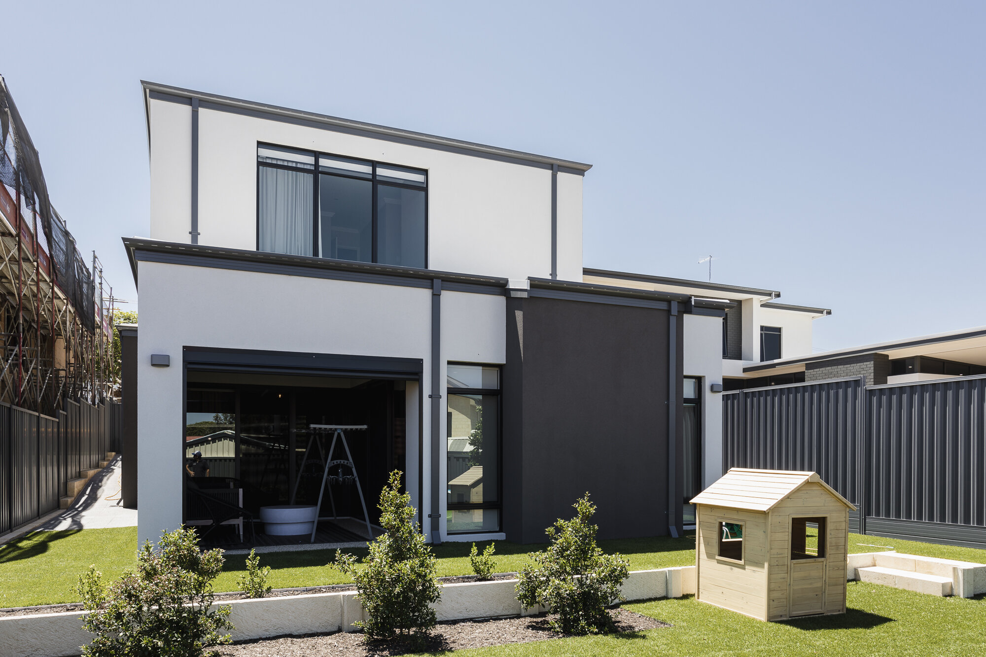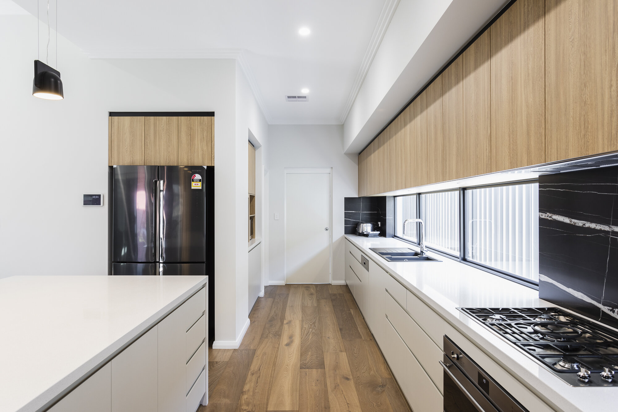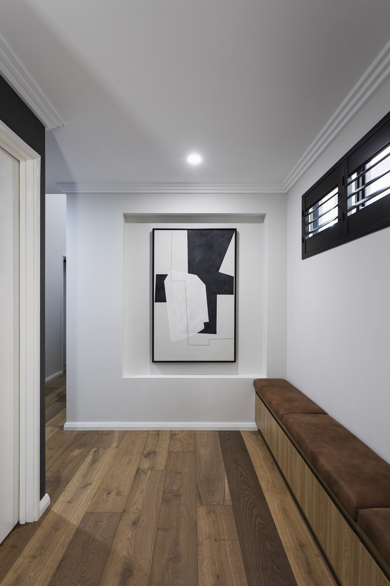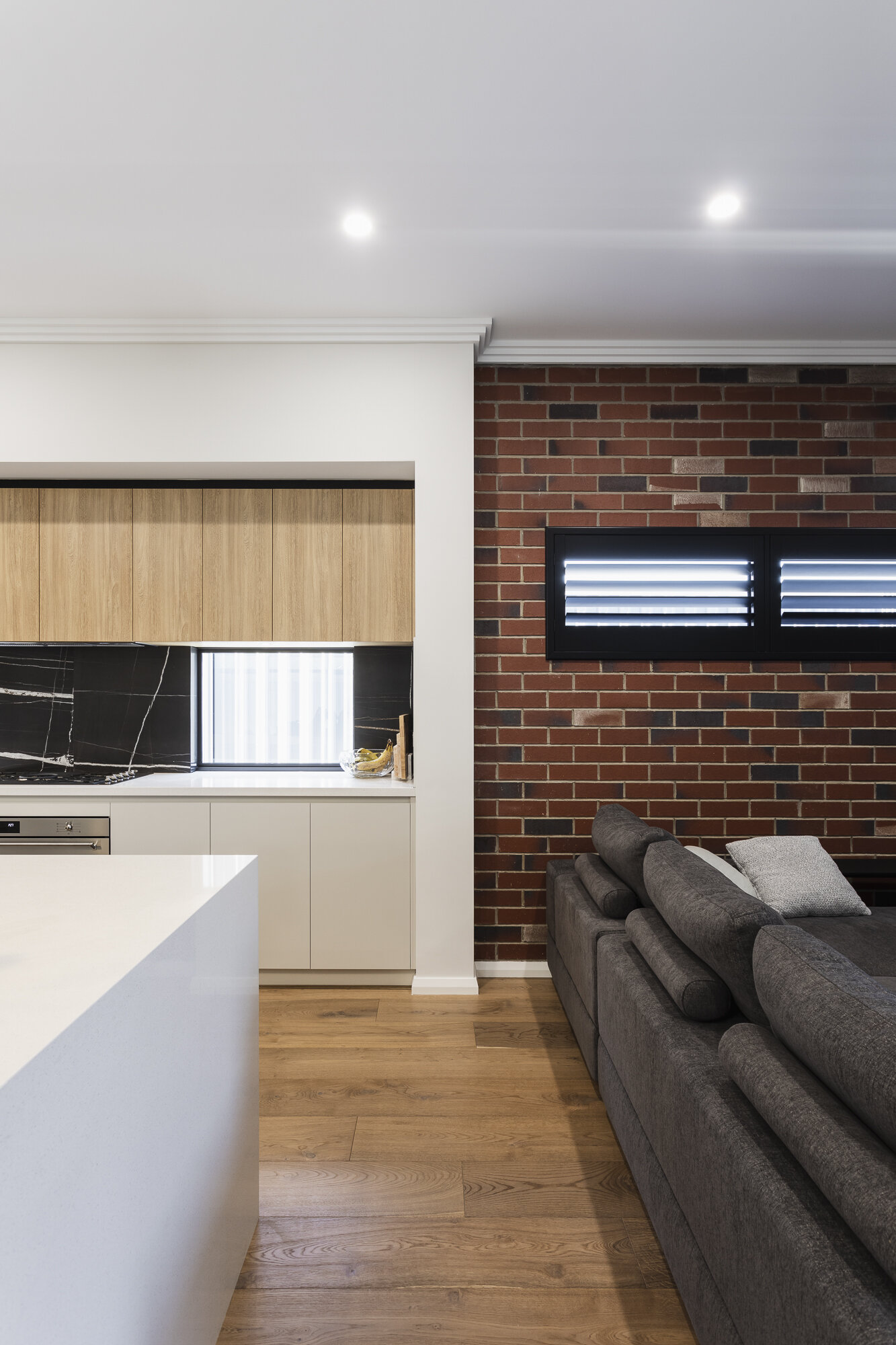 Monochrome details allowing the warm Walnut flooring to take centre stage in this Doubleview home.