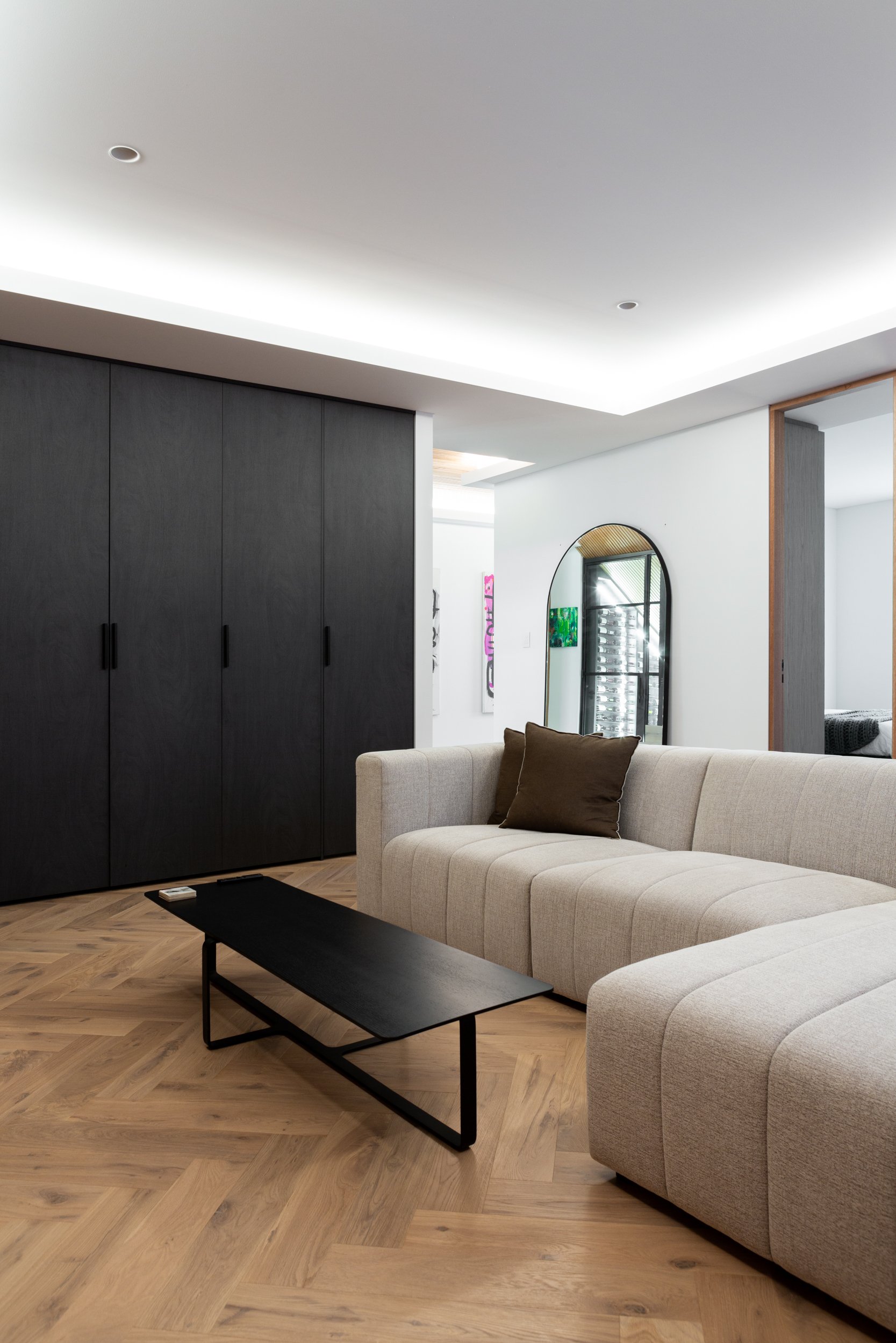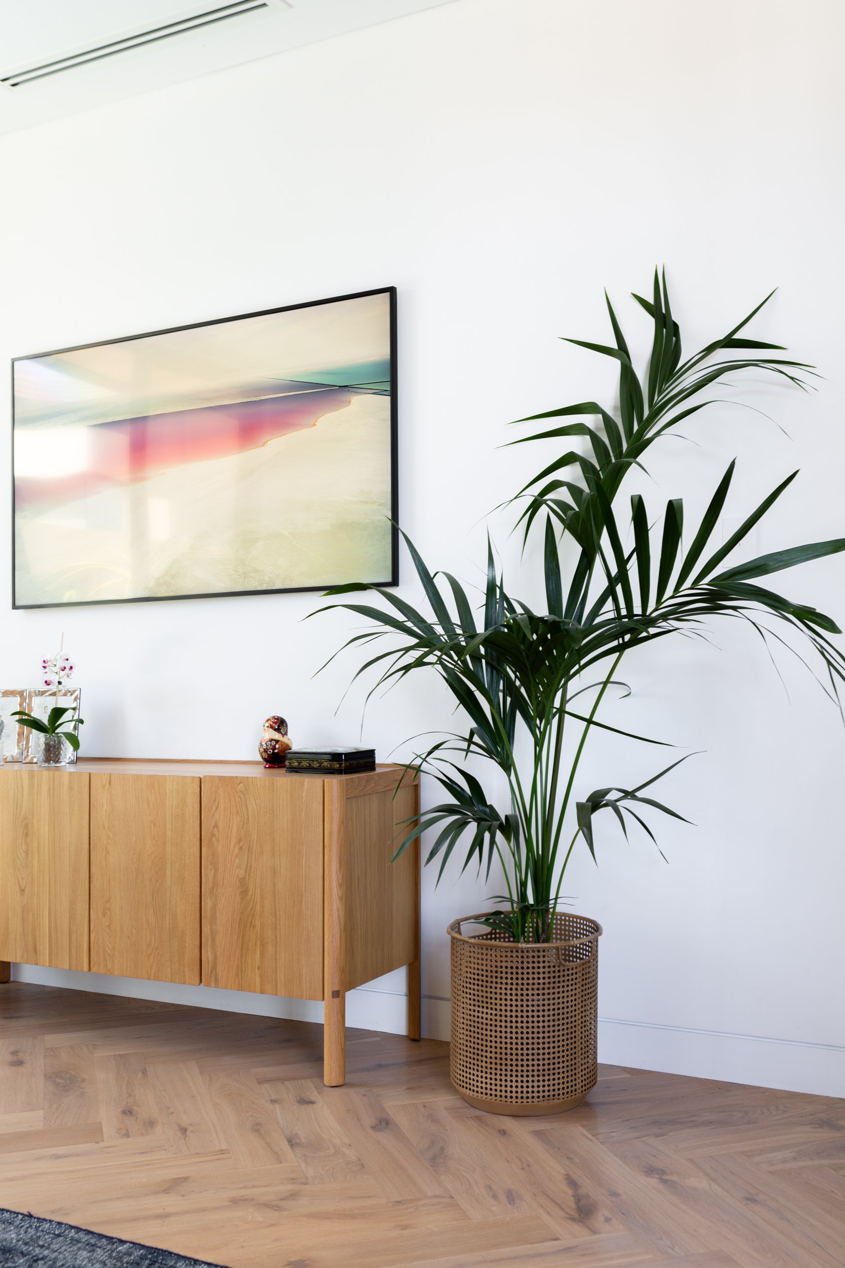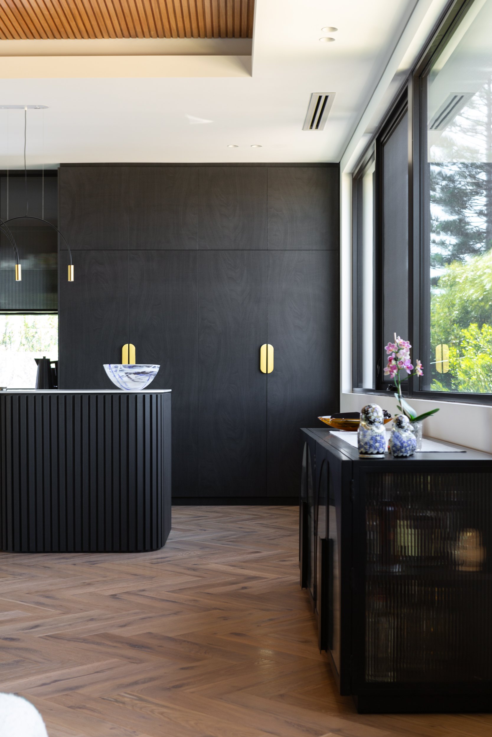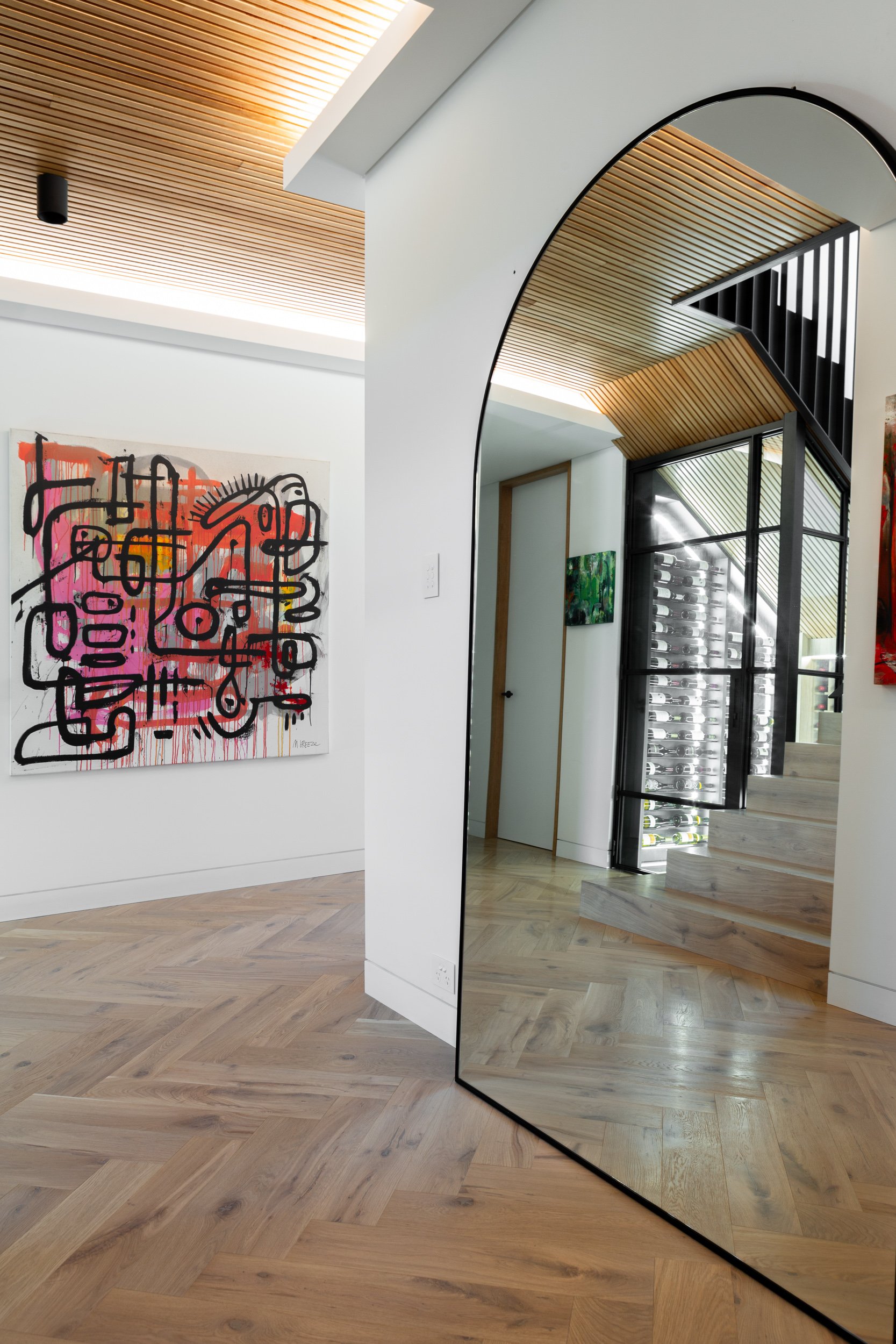 Ginger boards in a classic grade create a dynamic statement when laid in a herringbone pattern, creating movement and flow through this North Beach home.