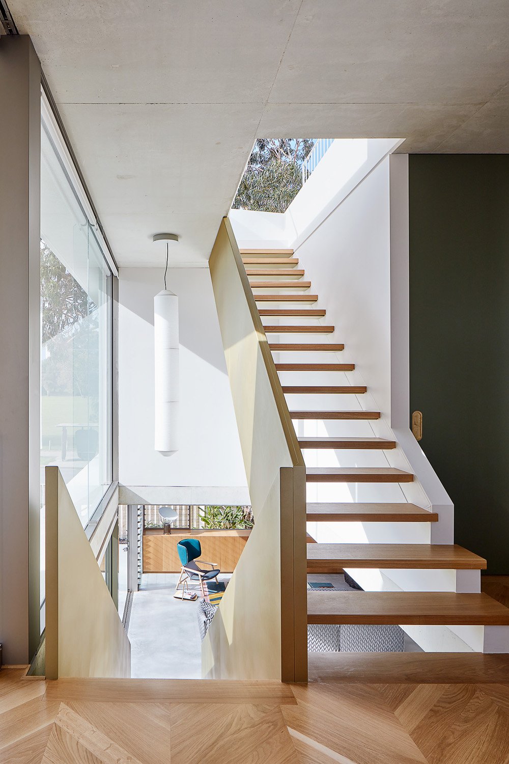 The overall design of this Mosman Park project emphasizes sustainability and functionality, making it a beautiful and practical family home. Solid Oak flooring has been crafted in a custom chevron pattern.