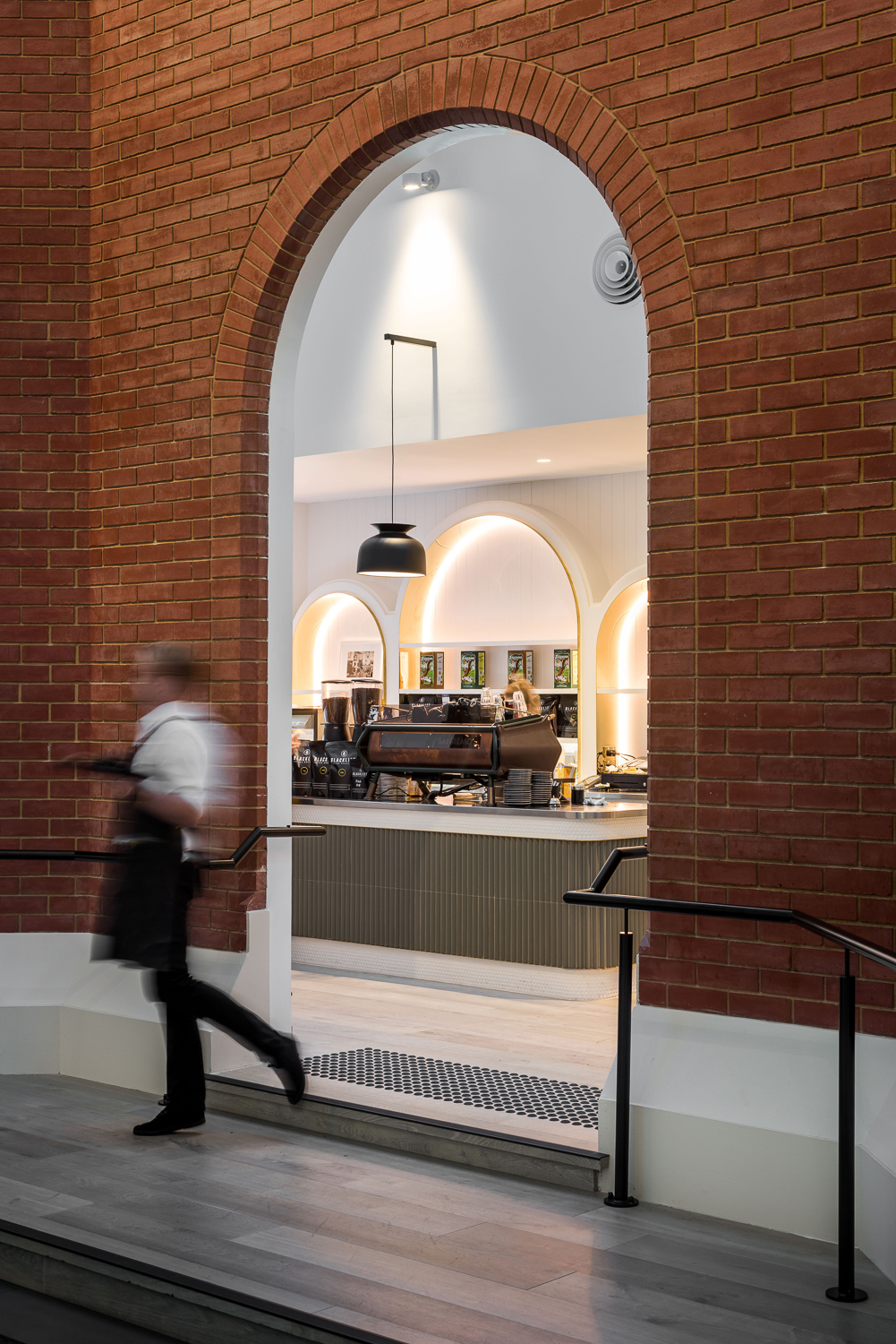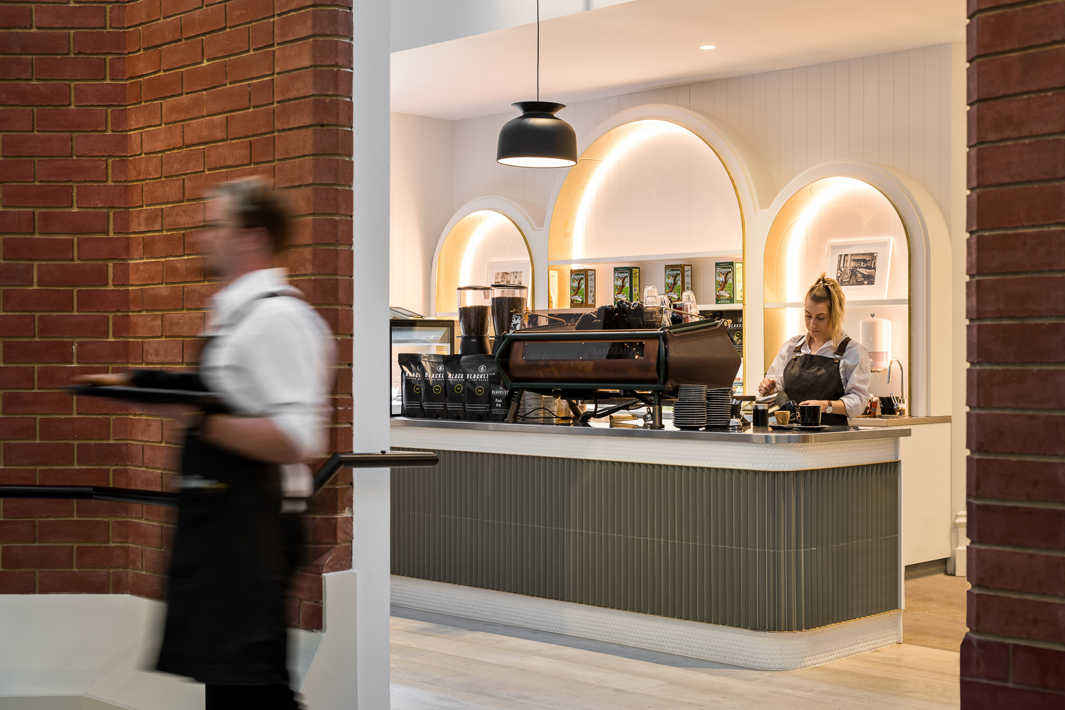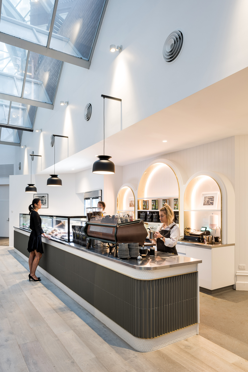 The Palace Cafe, designed by Woods Bagot, features a striking blend of contemporary design and heritage elements, creating a vibrant and welcoming space that enhances the dining experience.