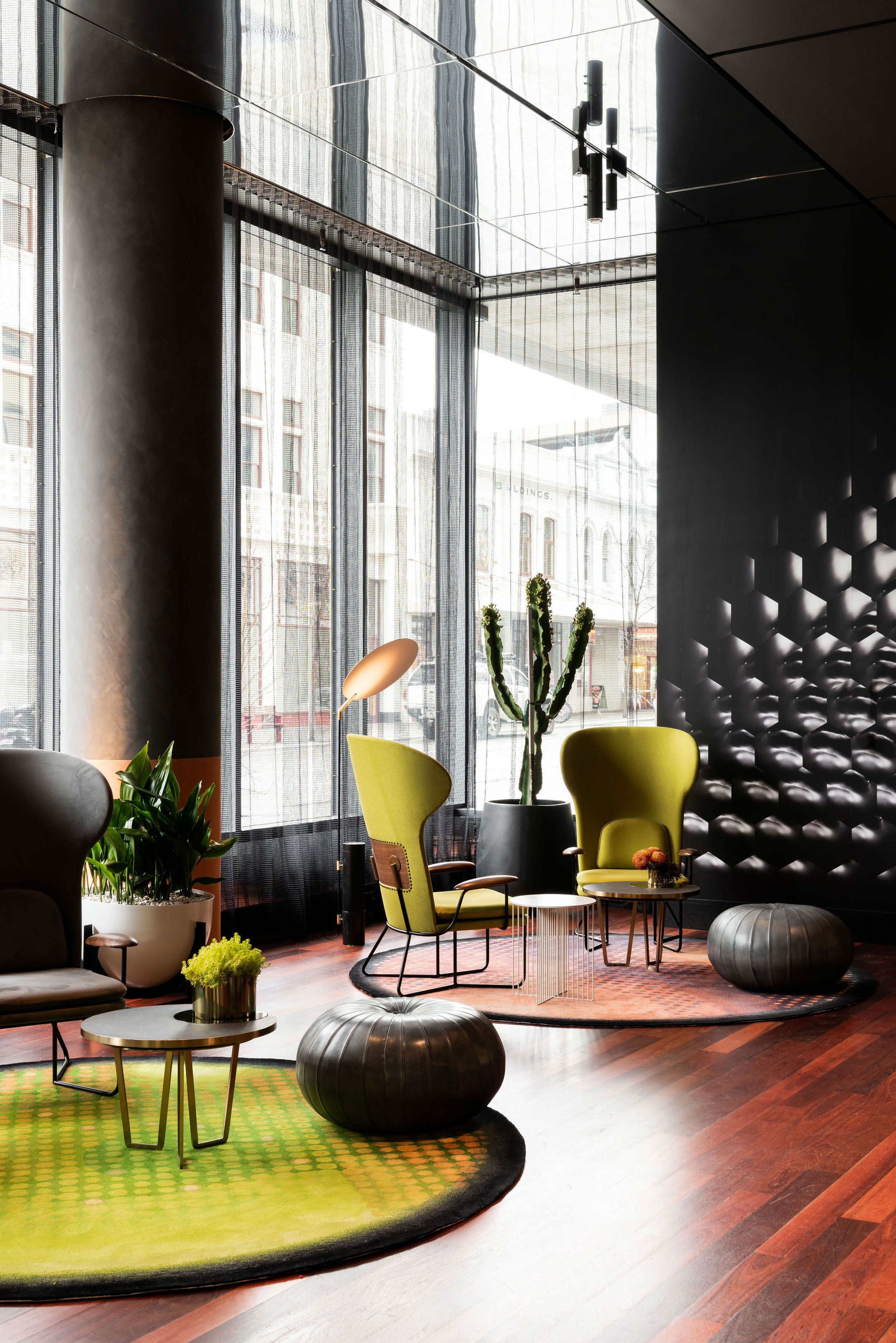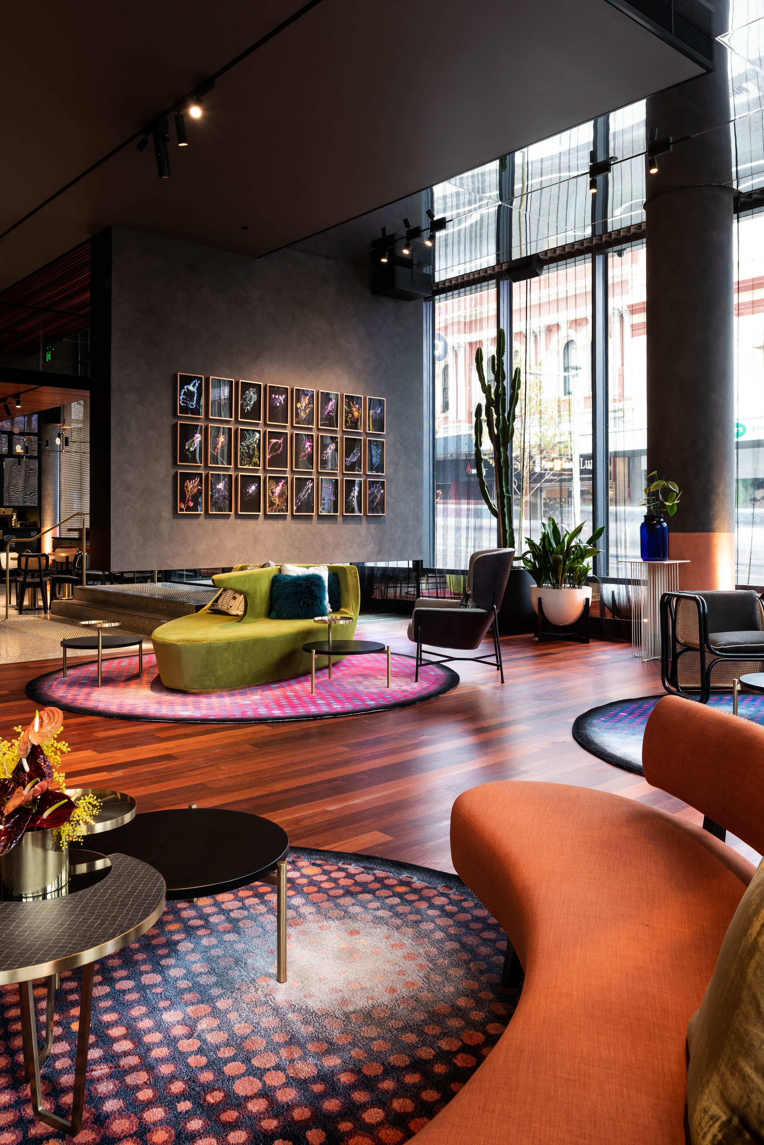 QT Perth Hotel features contemporary luxury with a playful aesthetic, reflecting the city's vibrant culture. Plush fabrics, sleek surfaces and Jarrah flooring enhance comfort and elegance throughout the spaces.