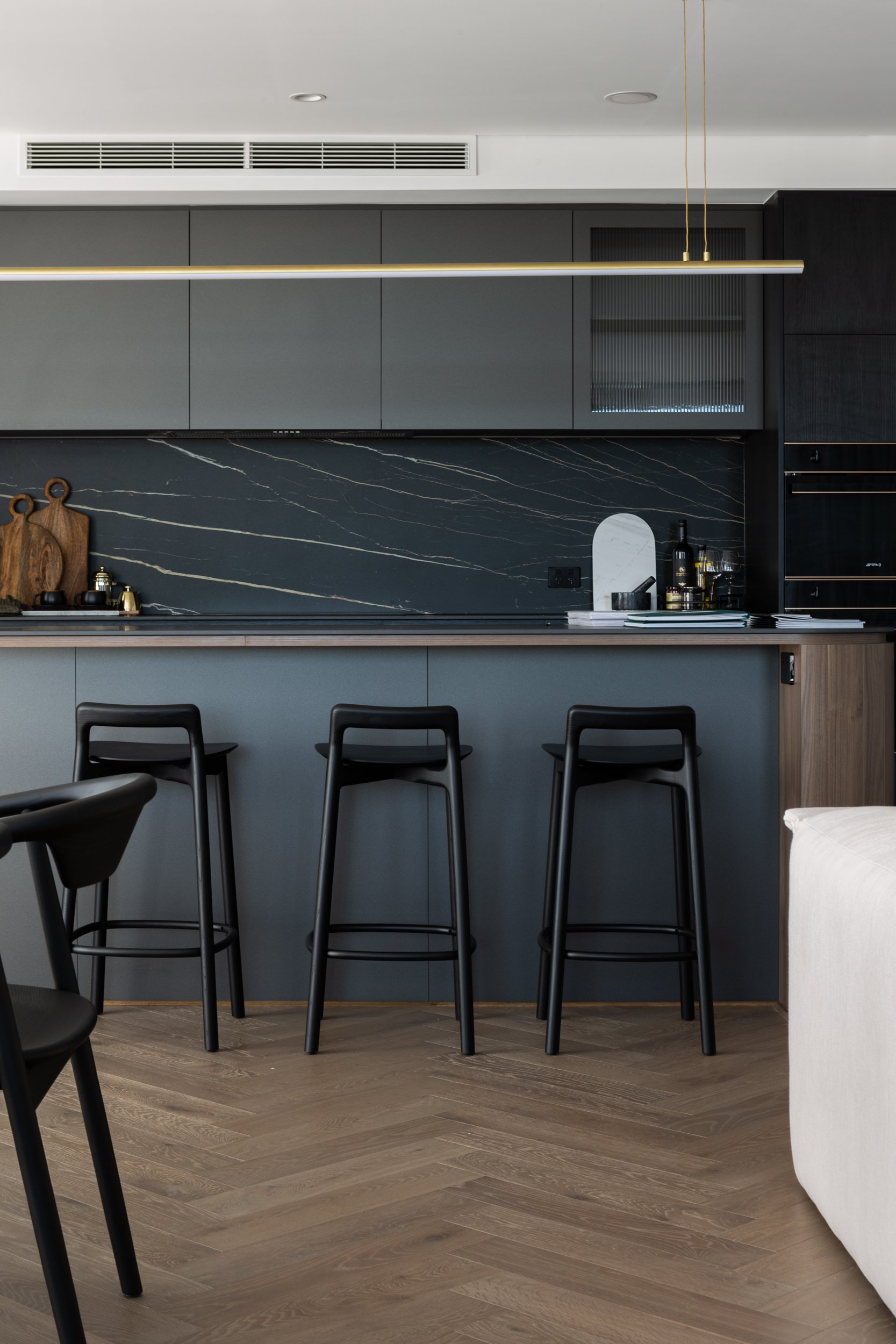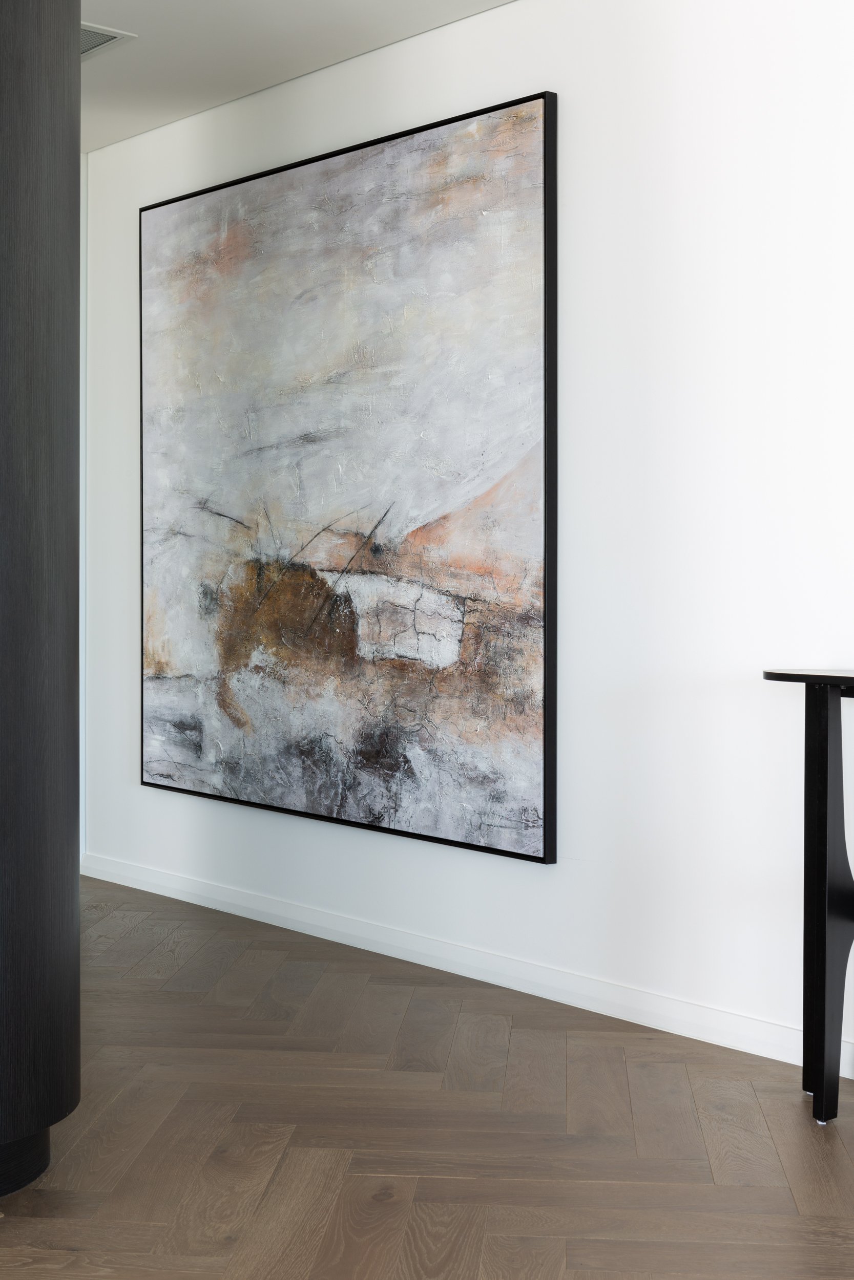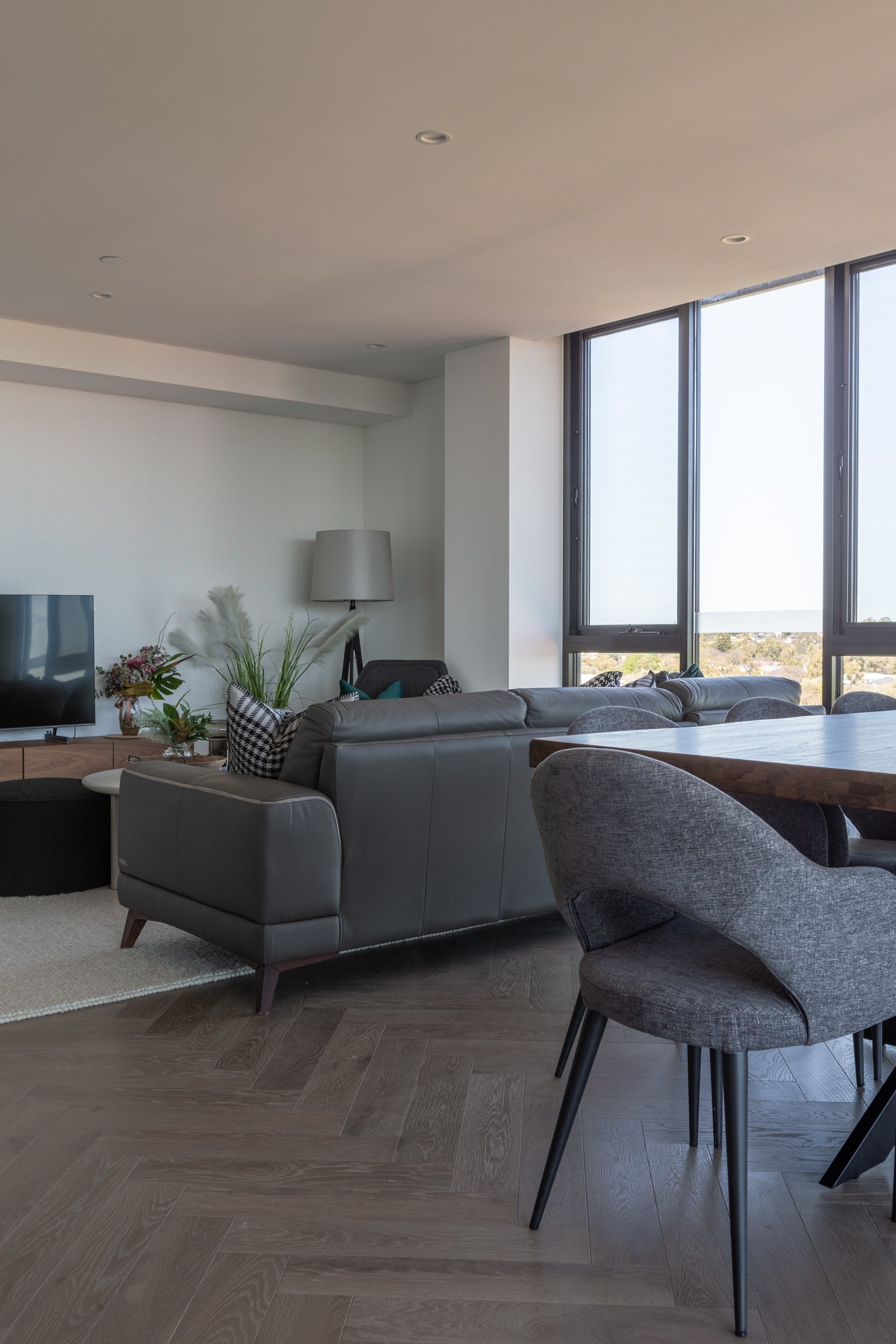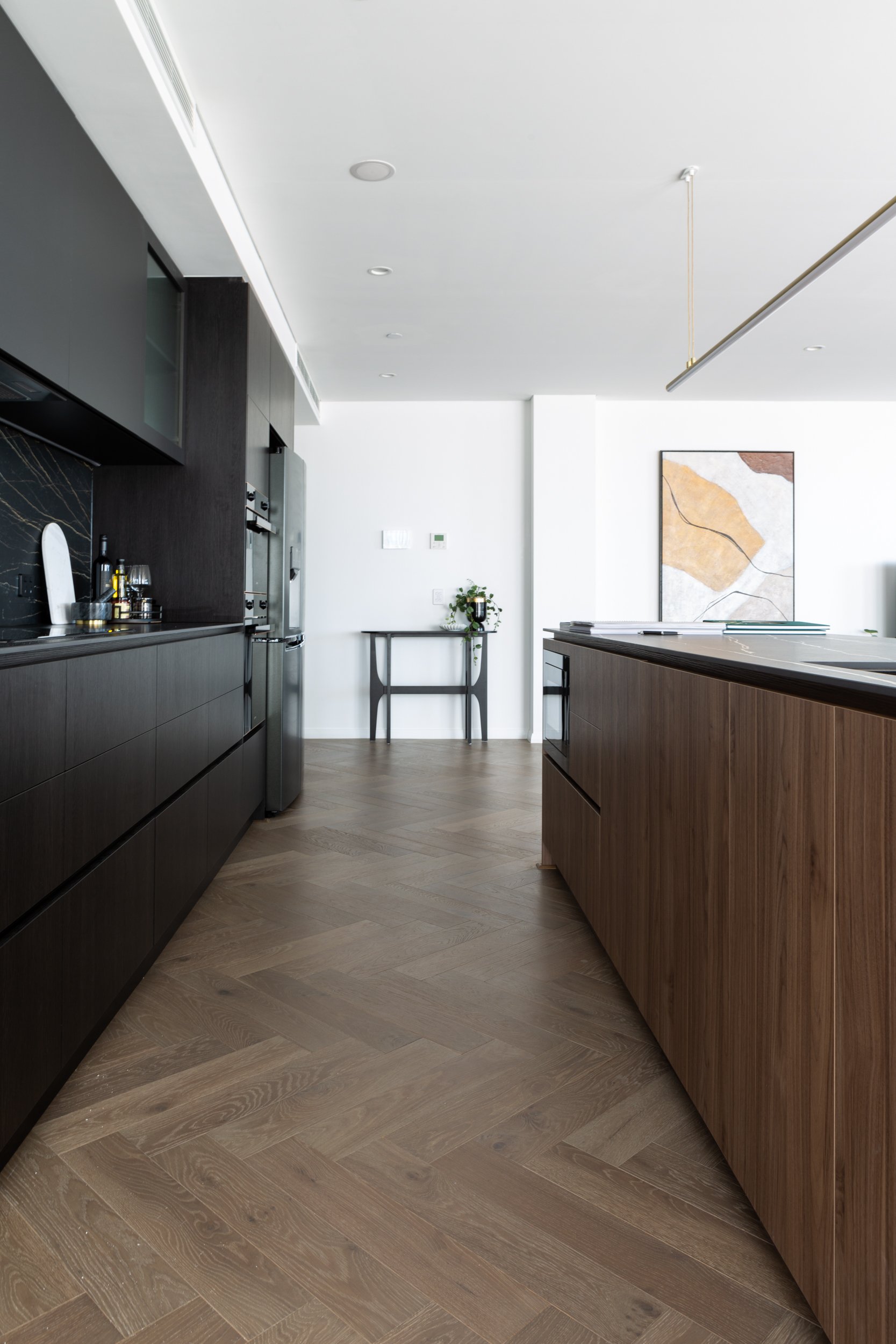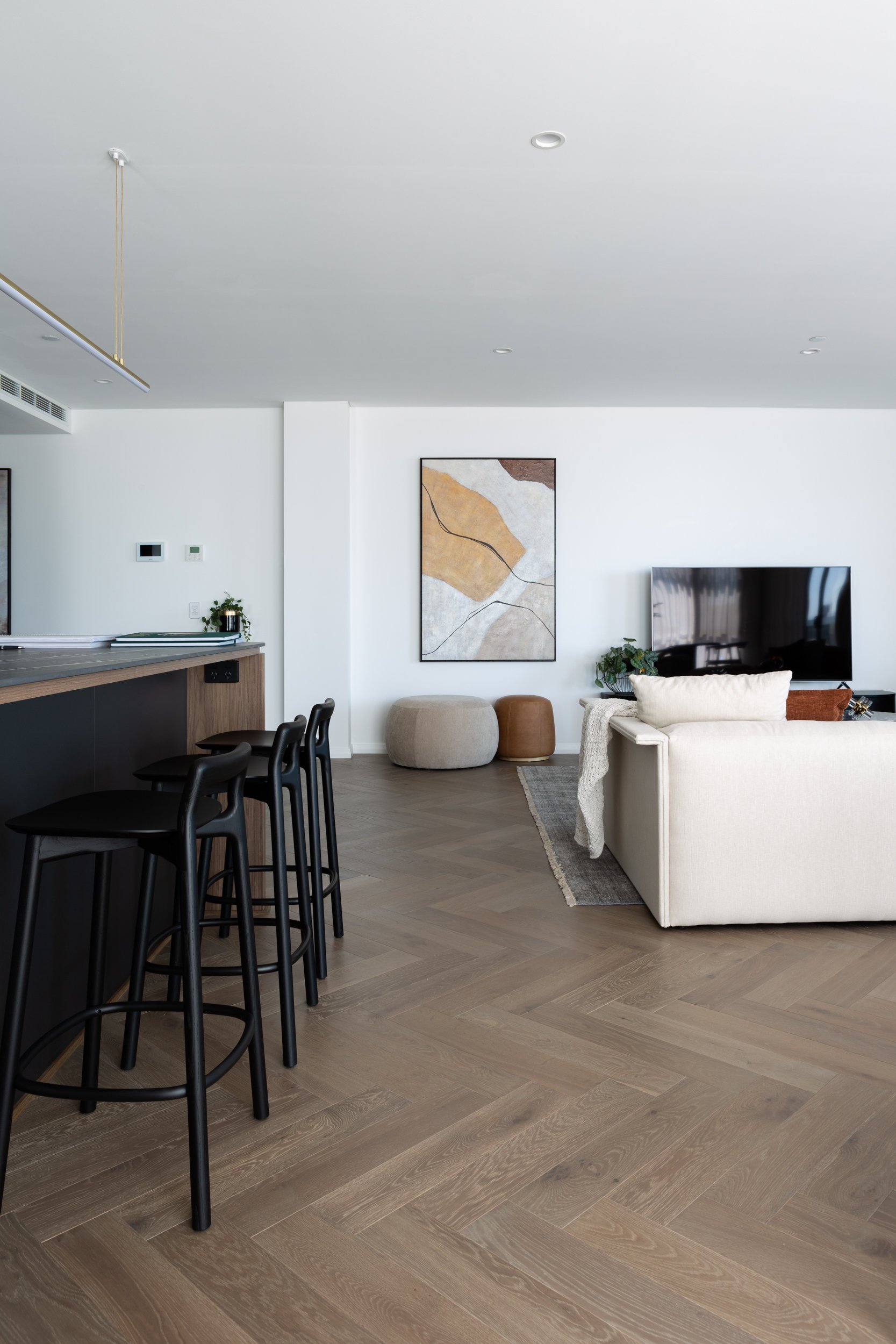 Sanctuary Apartments feature a modern and sophisticated aesthetic, focused on creating a harmonious living environment. A calming palette of soft, neutral tones creates a serene atmosphere, complemented by high-quality finishes and custom herringbone flooring in Moondance from our Signature Oak Range.