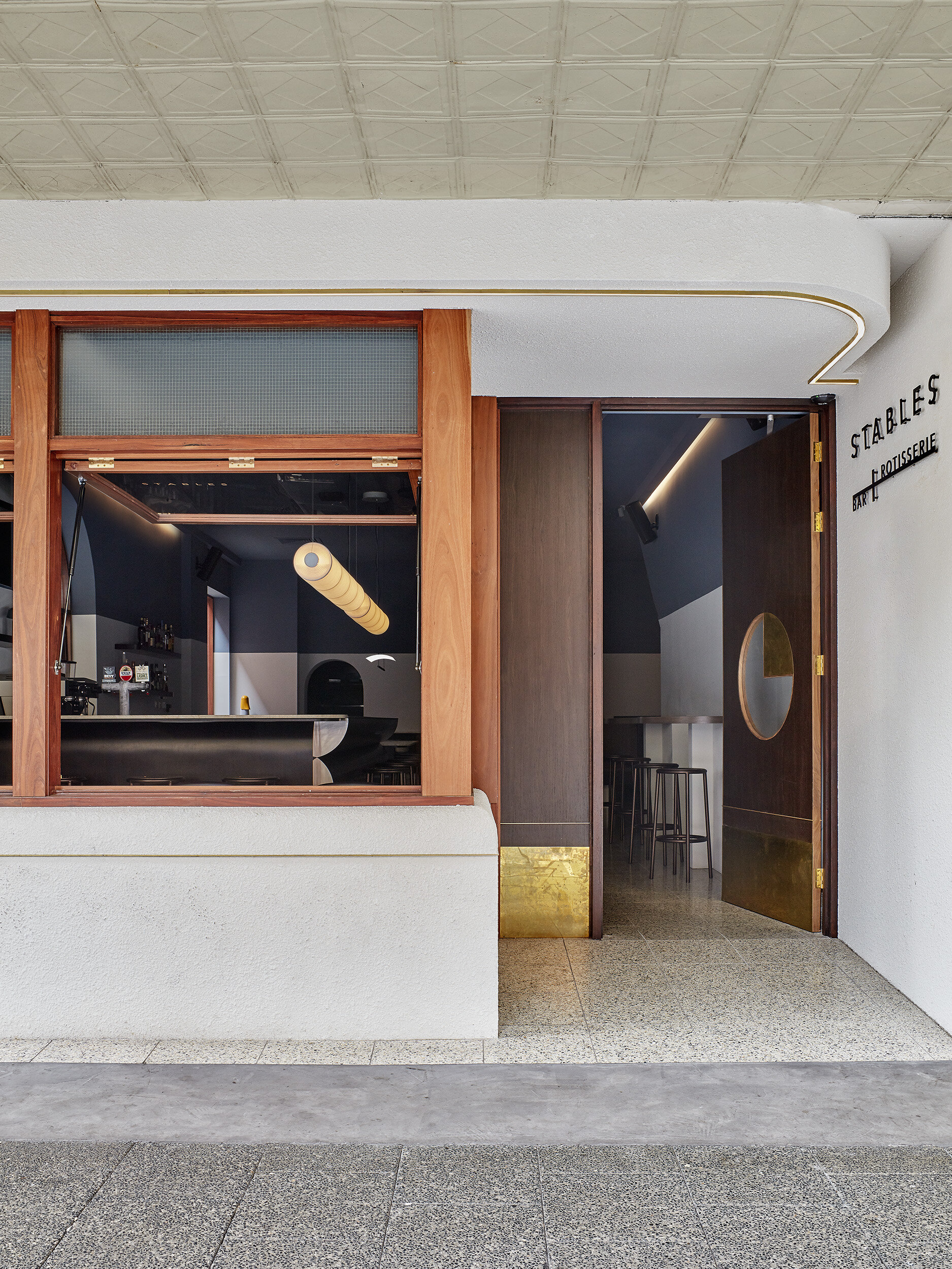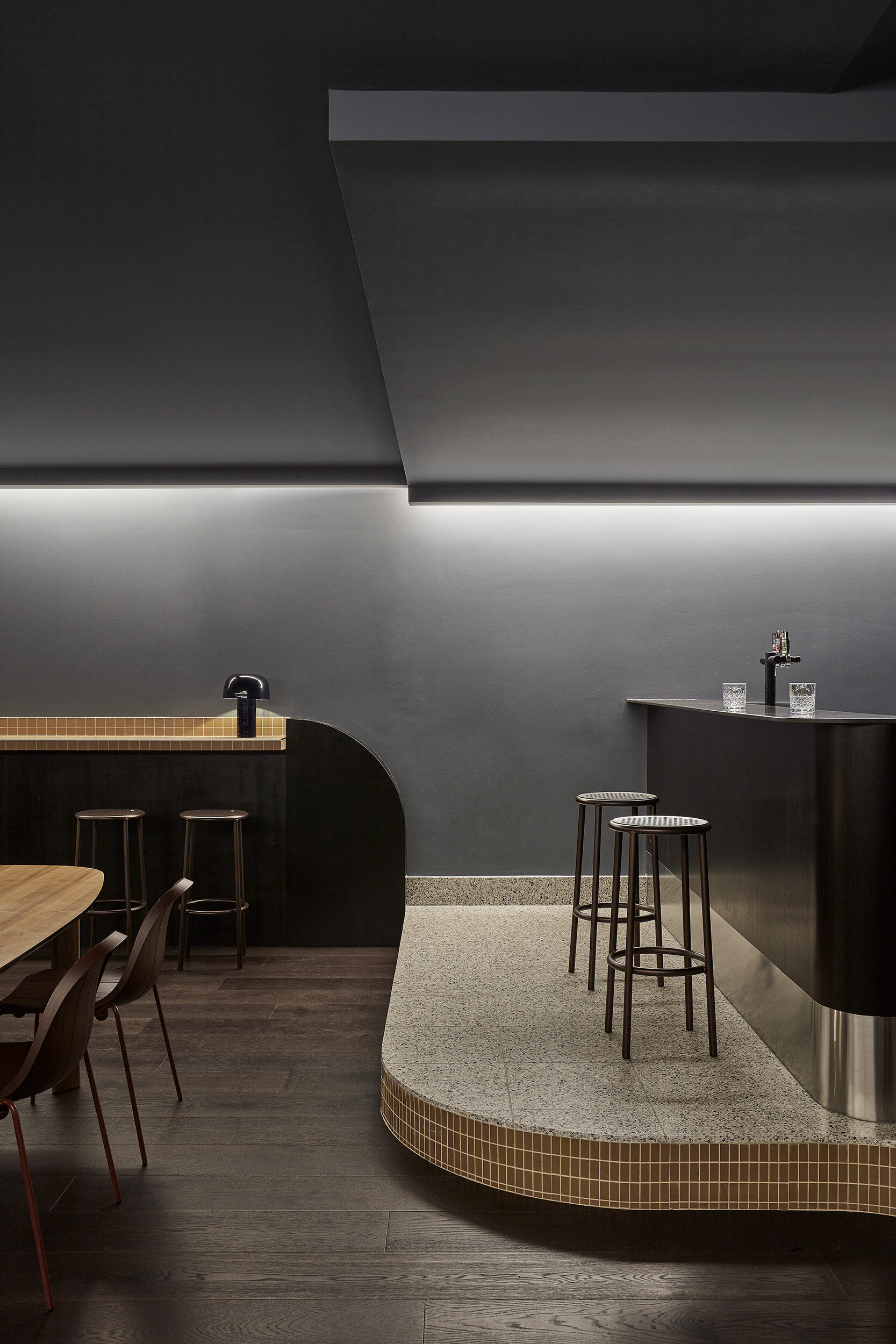 A combination of Brushed Cocoa oak and terrazzo flooring, sculptural forms and a rich colour palette set the mood at this addition to the Stables Bar, known as Little Stables.
