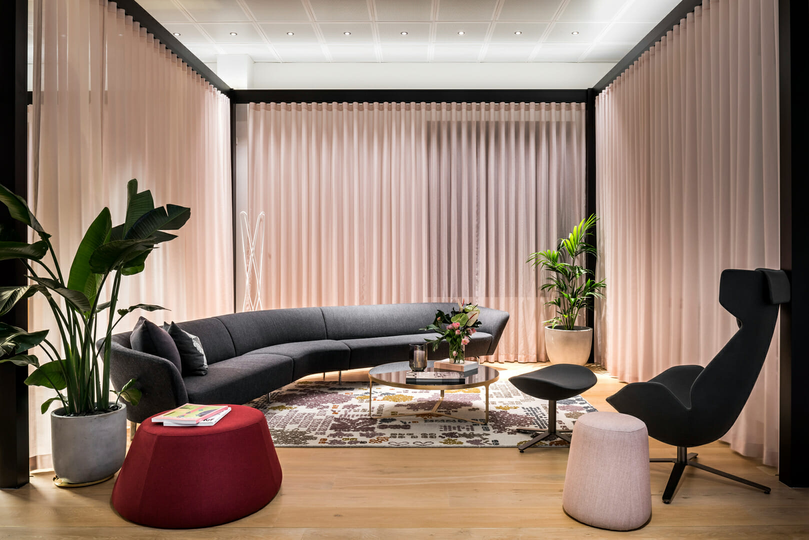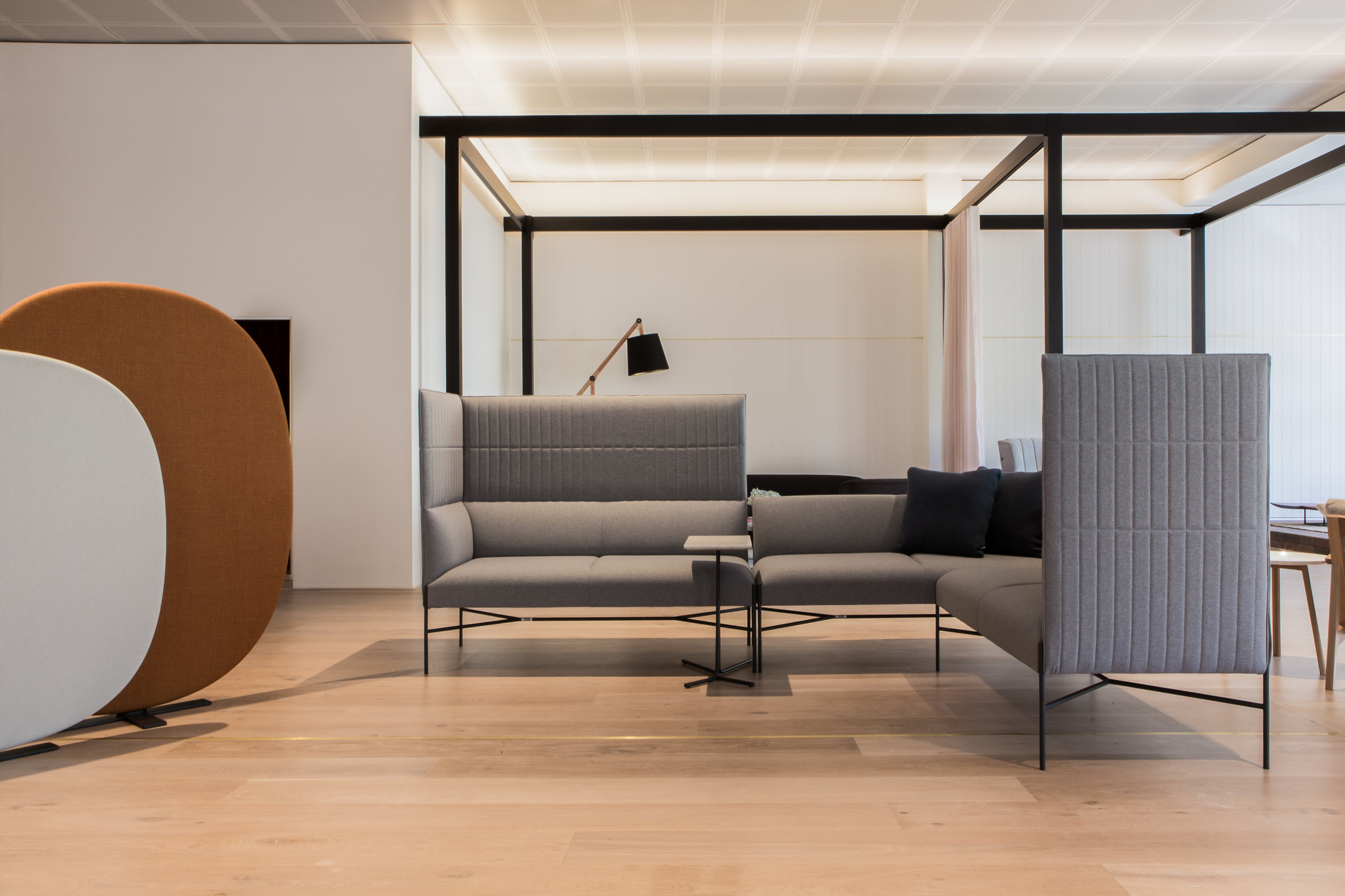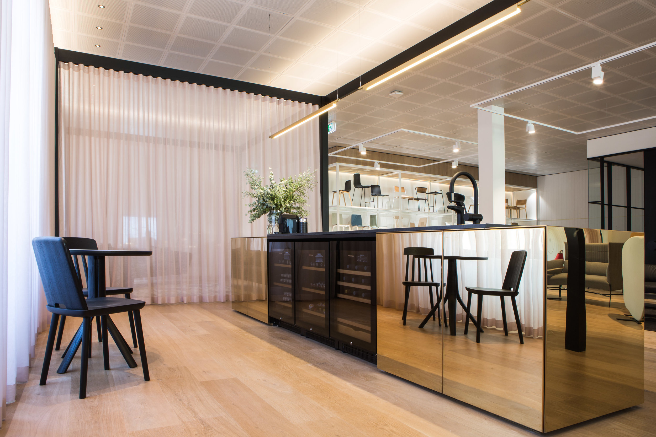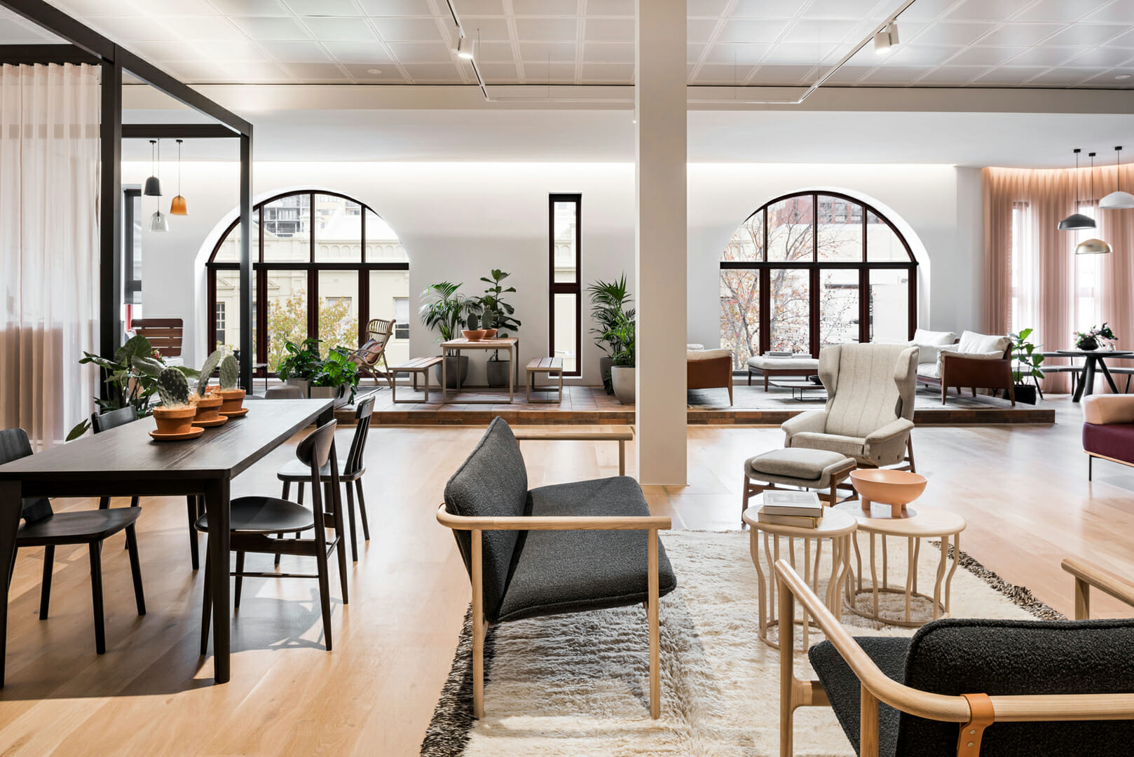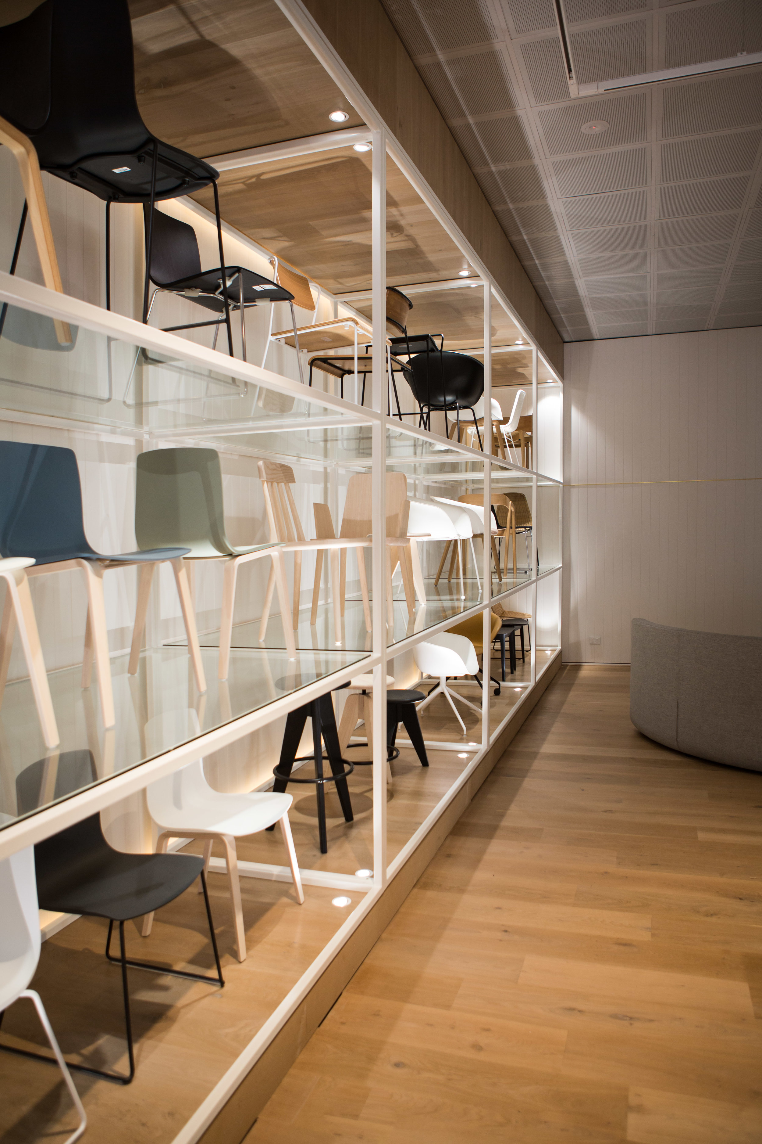 The Stylecraft showroom designed by Woods Bagot features a contemporary and immersive environment that showcases innovative furnishings and designs, blending functionality with aesthetic appeal to inspire creativity and collaboration. The flooring is a Cleanslate Oak (220mm) with custom stain.