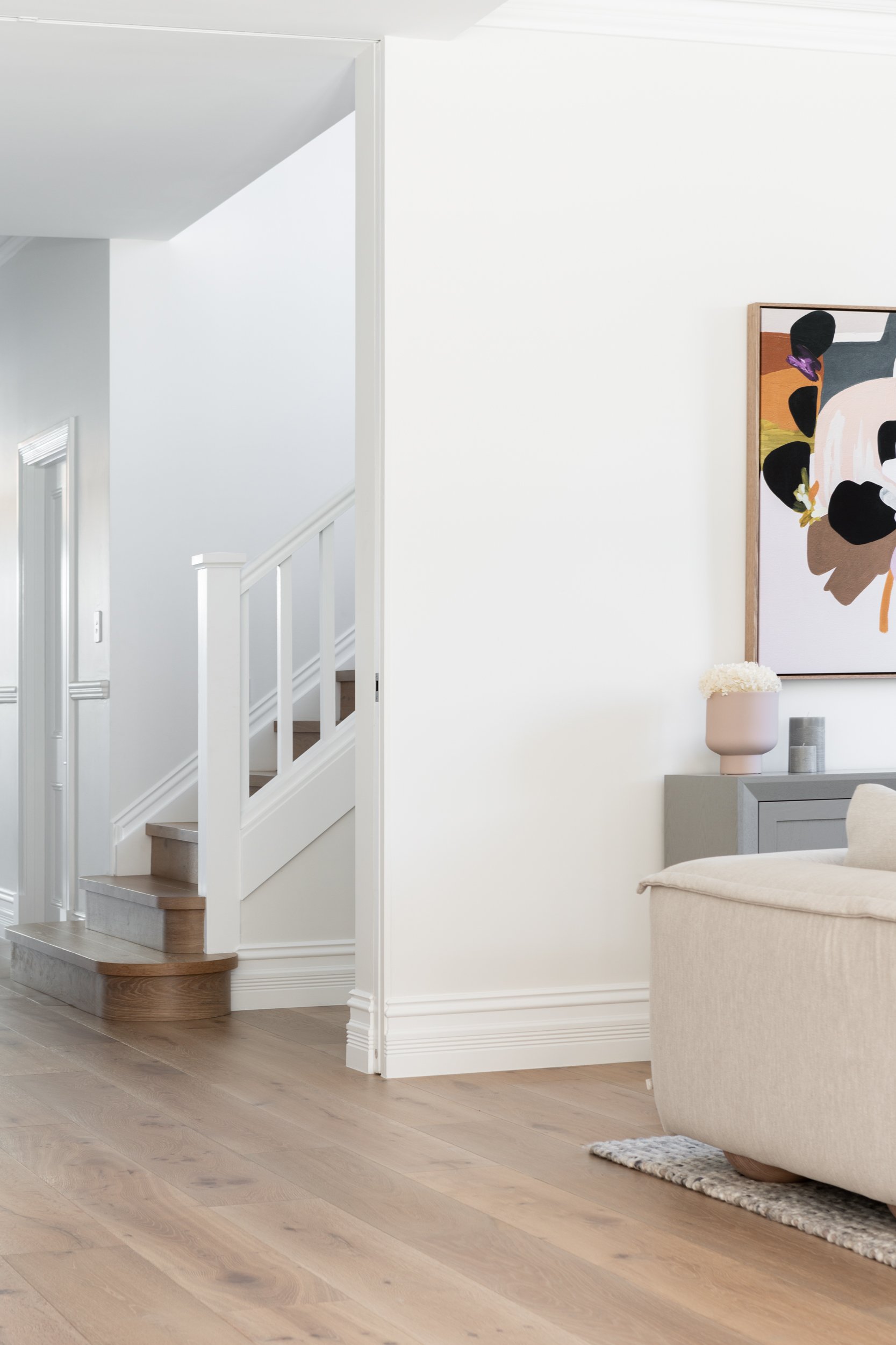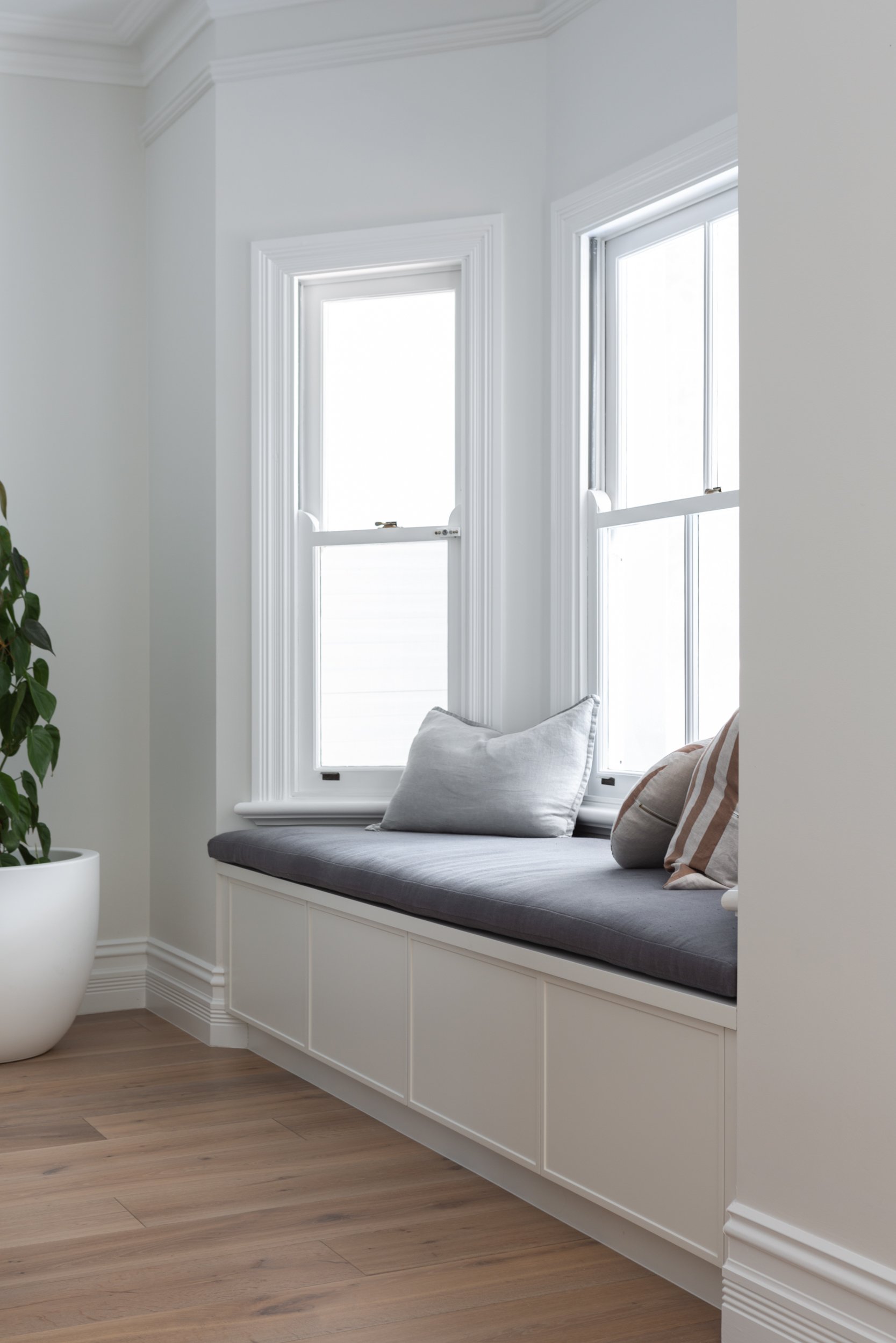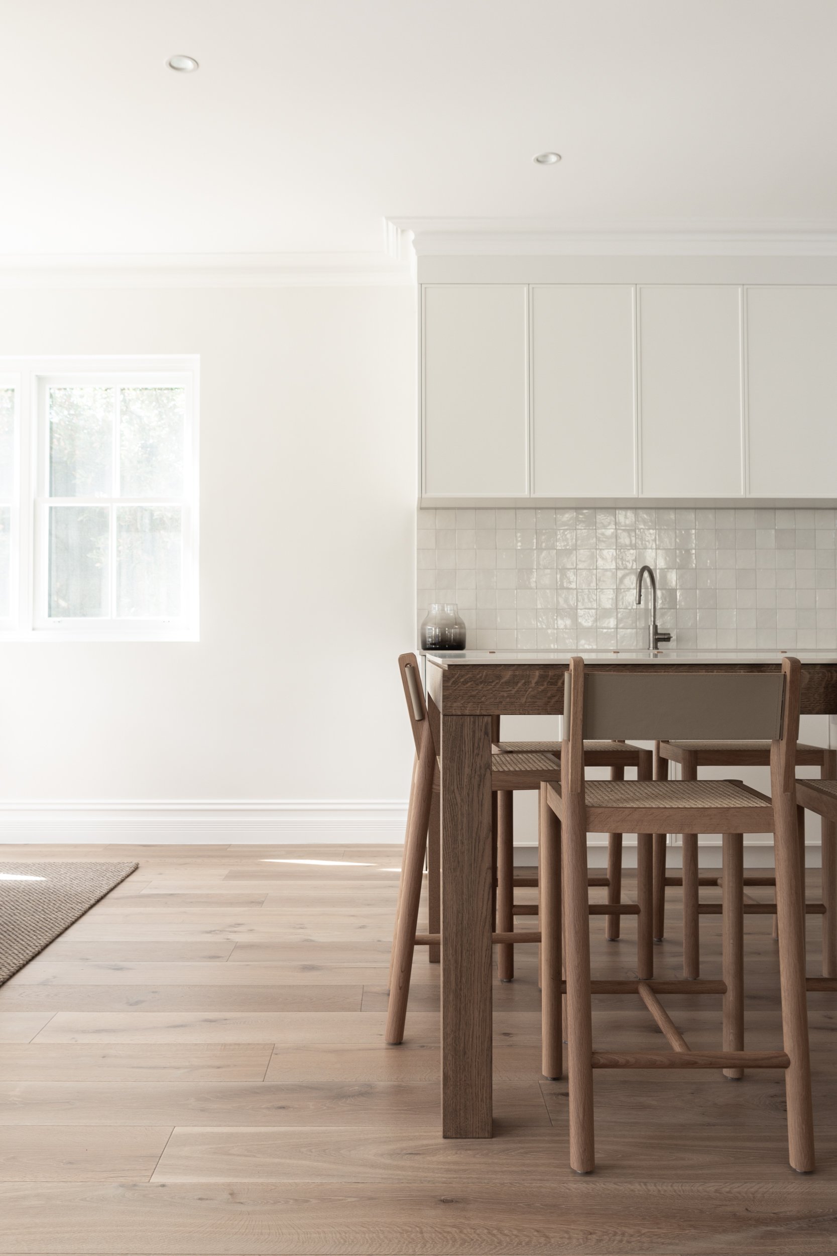Warm whites, linen and and Vermont flooring complement the coastal aesthetic in this Swanbourne home.