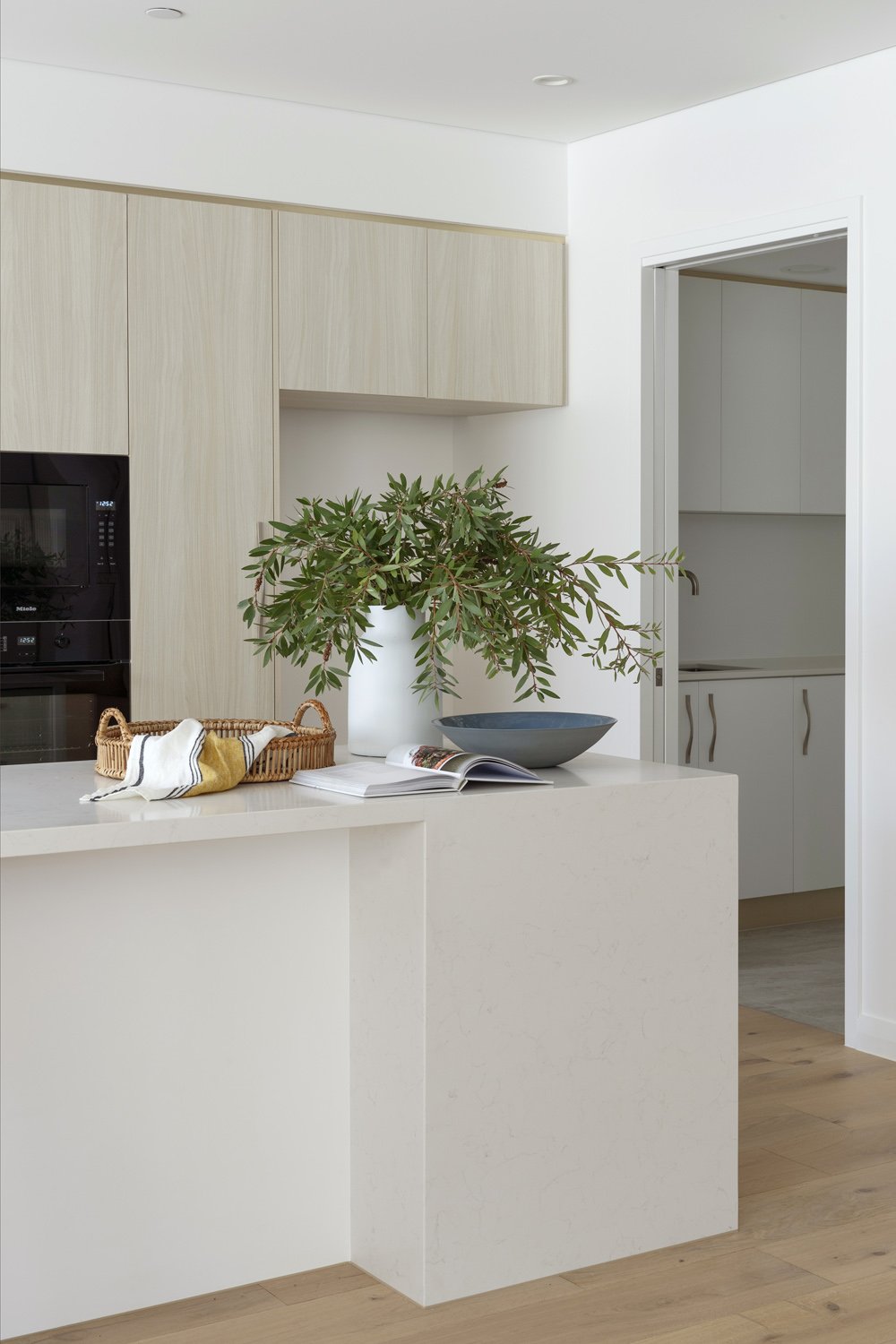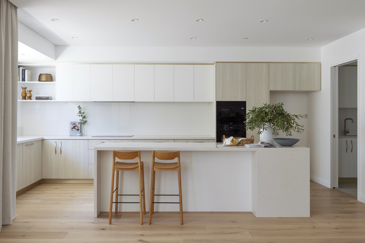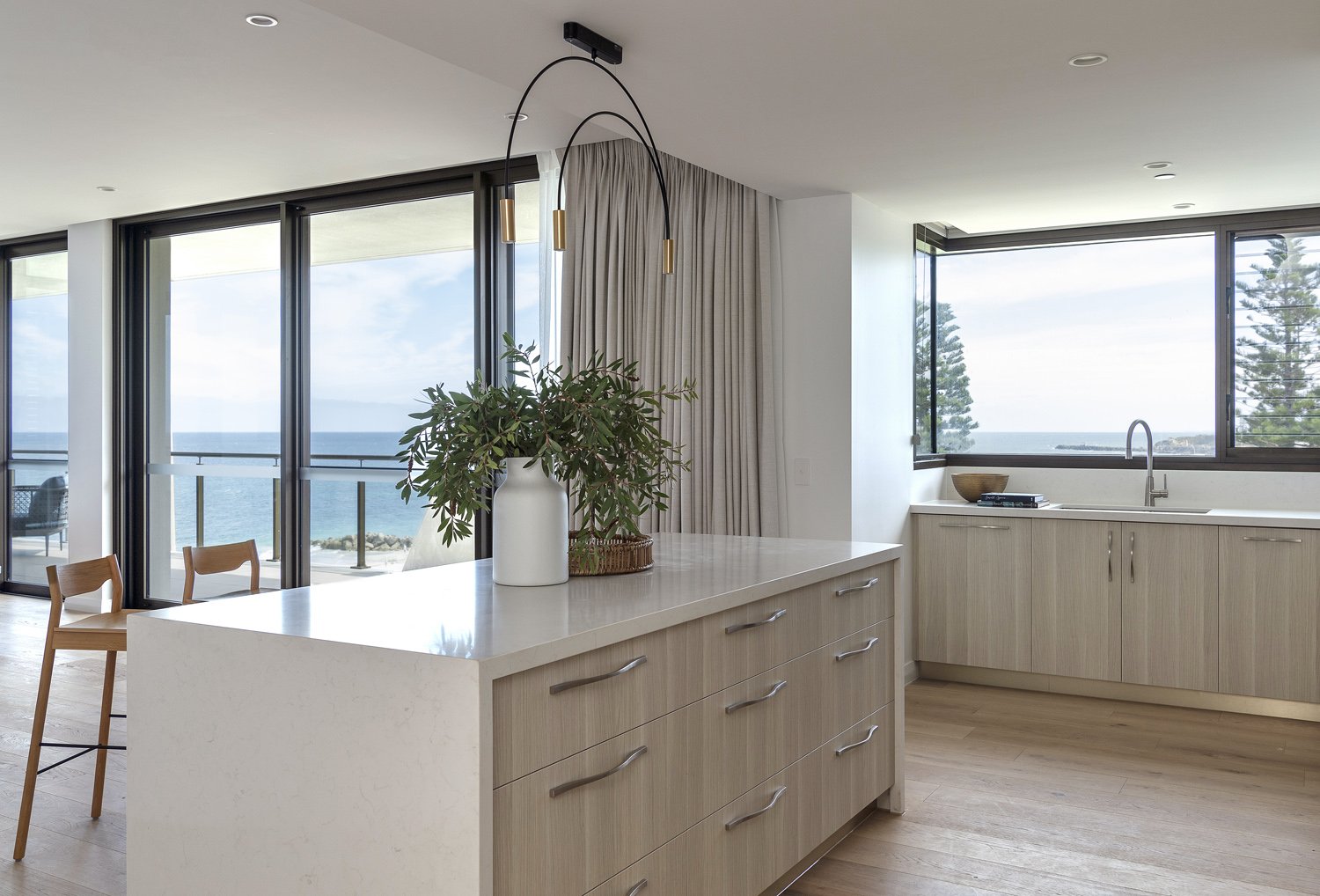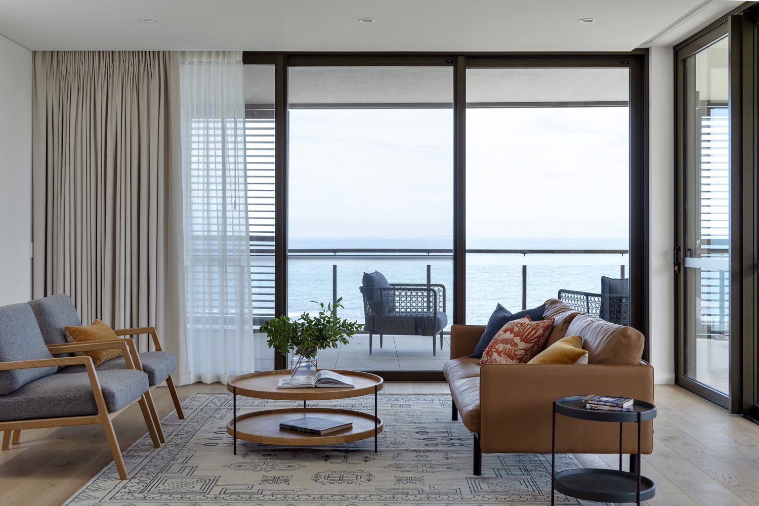 The interior design of the Waterfront apartments in Cottesloe exudes a blend of luxury and coastal living, perfectly capturing the essence of their stunning oceanfront location.