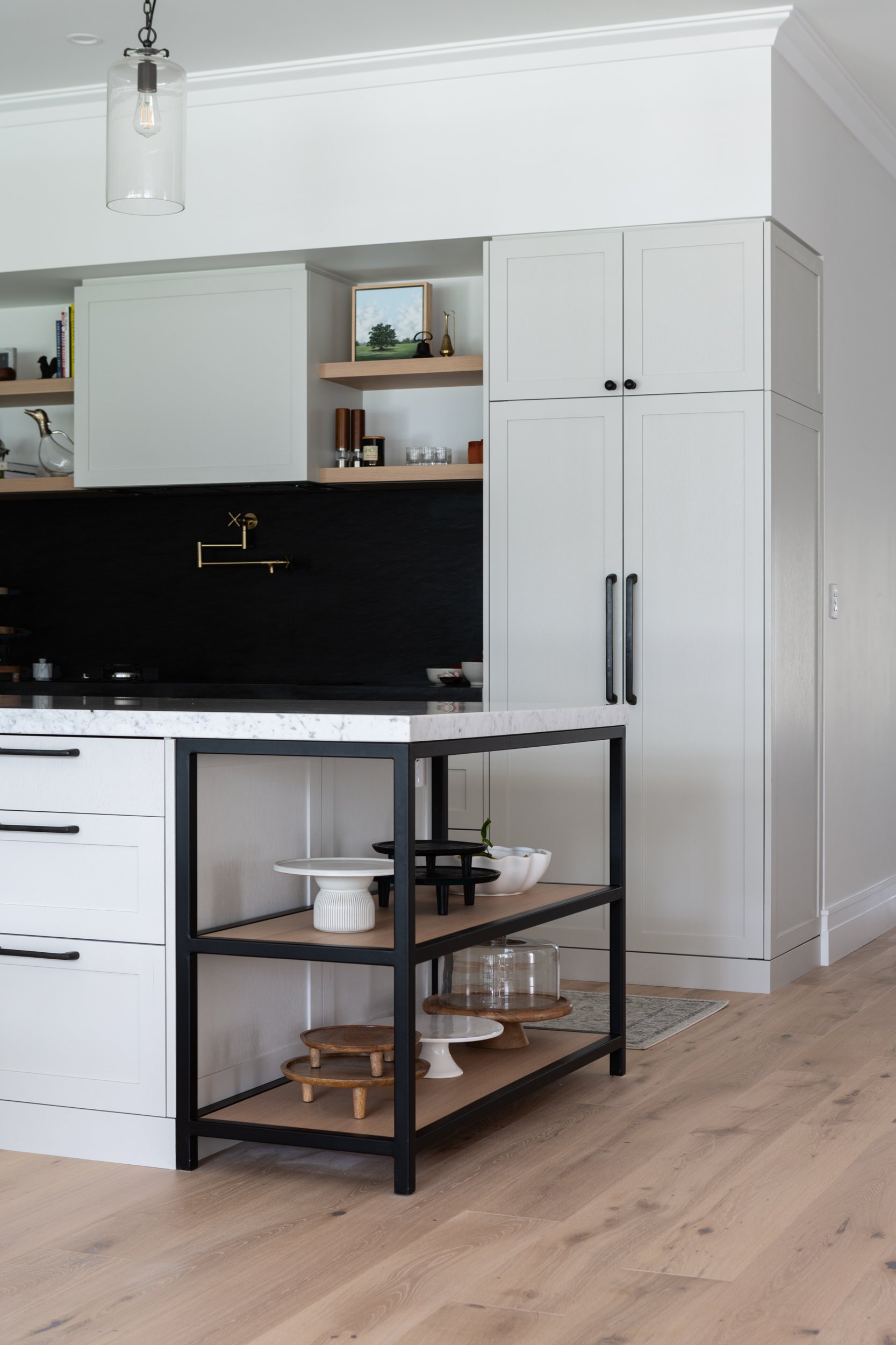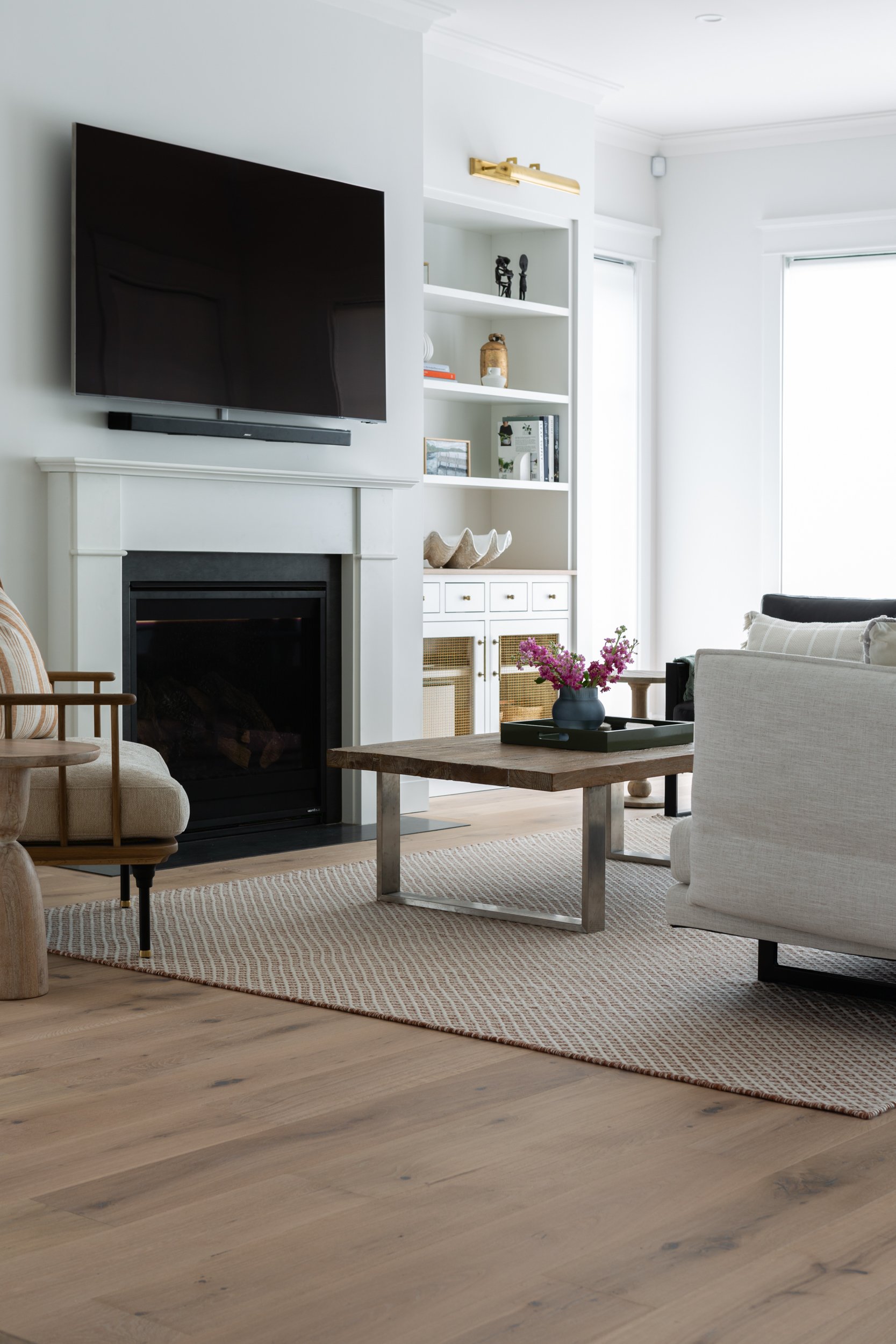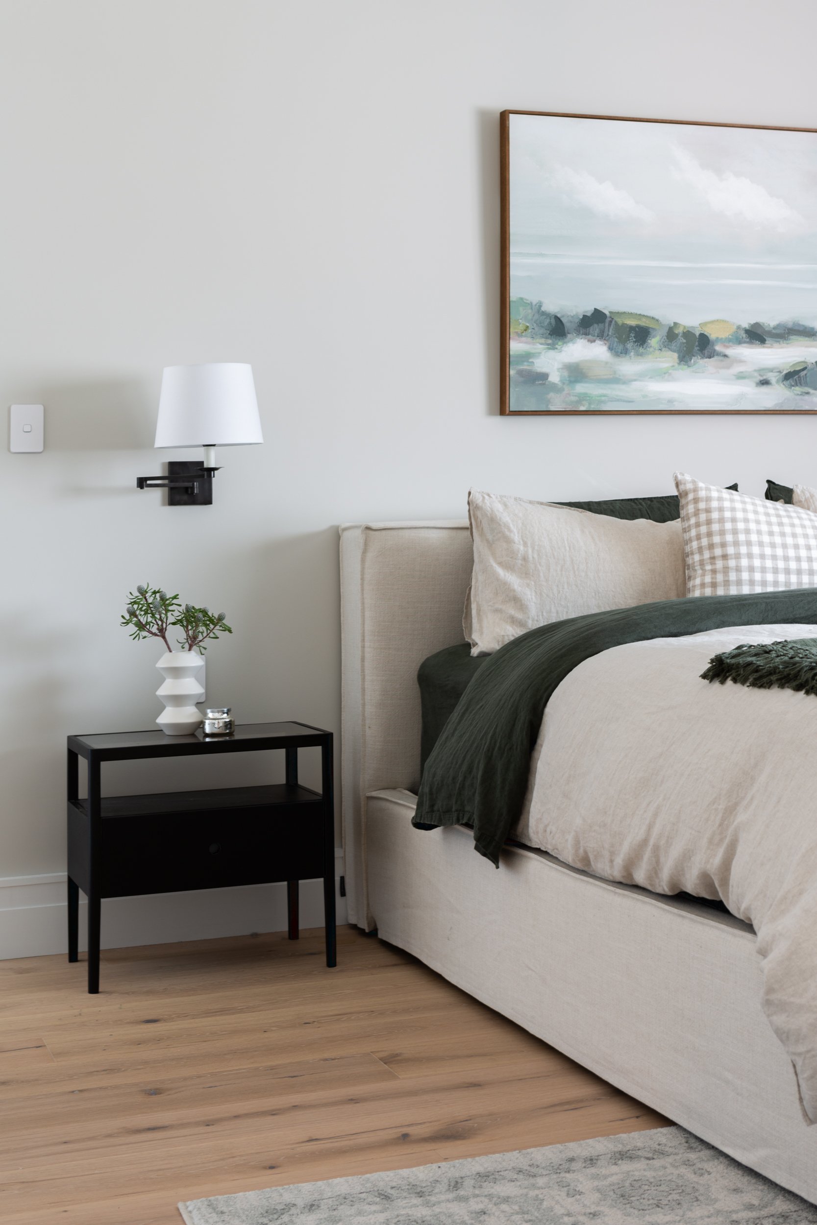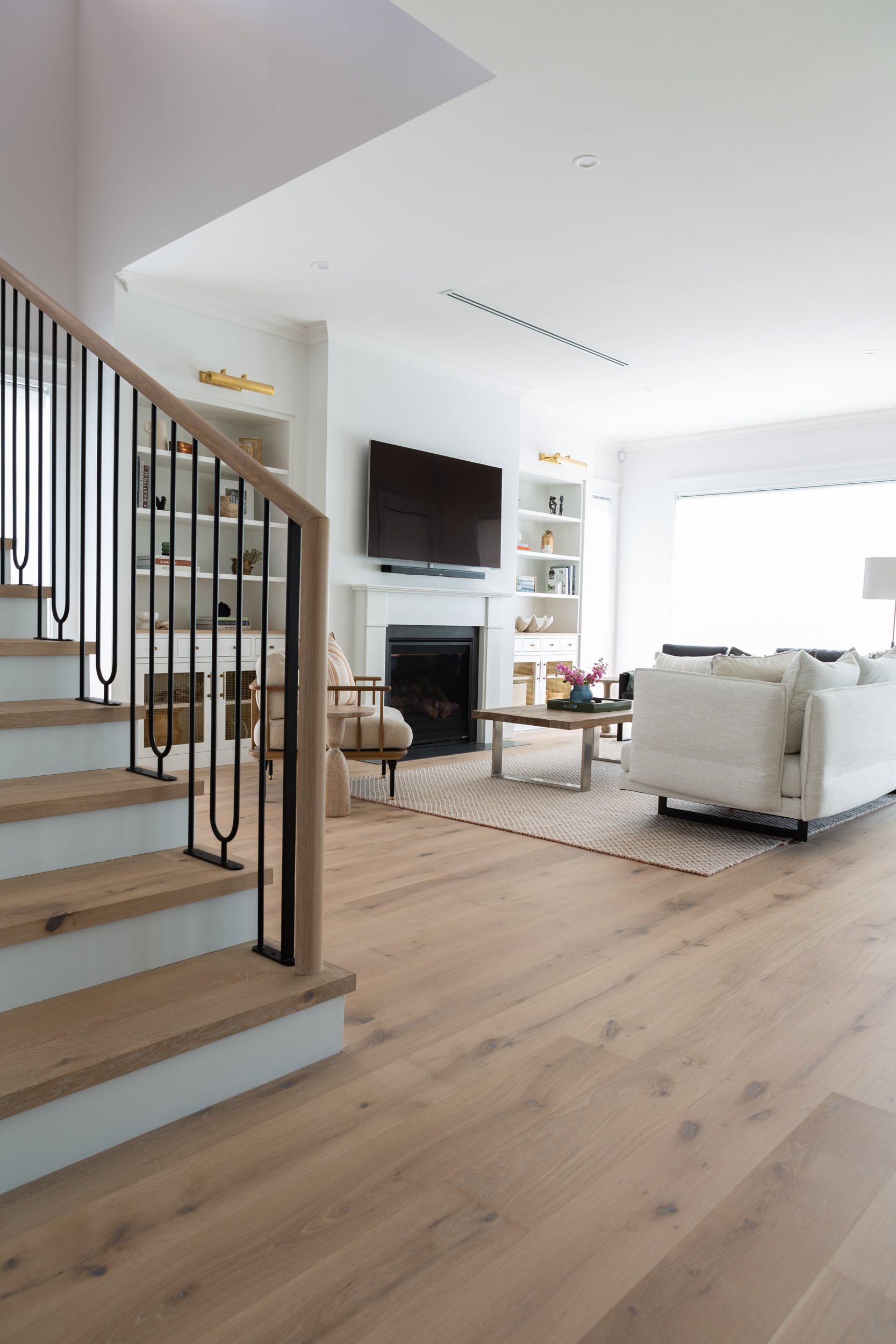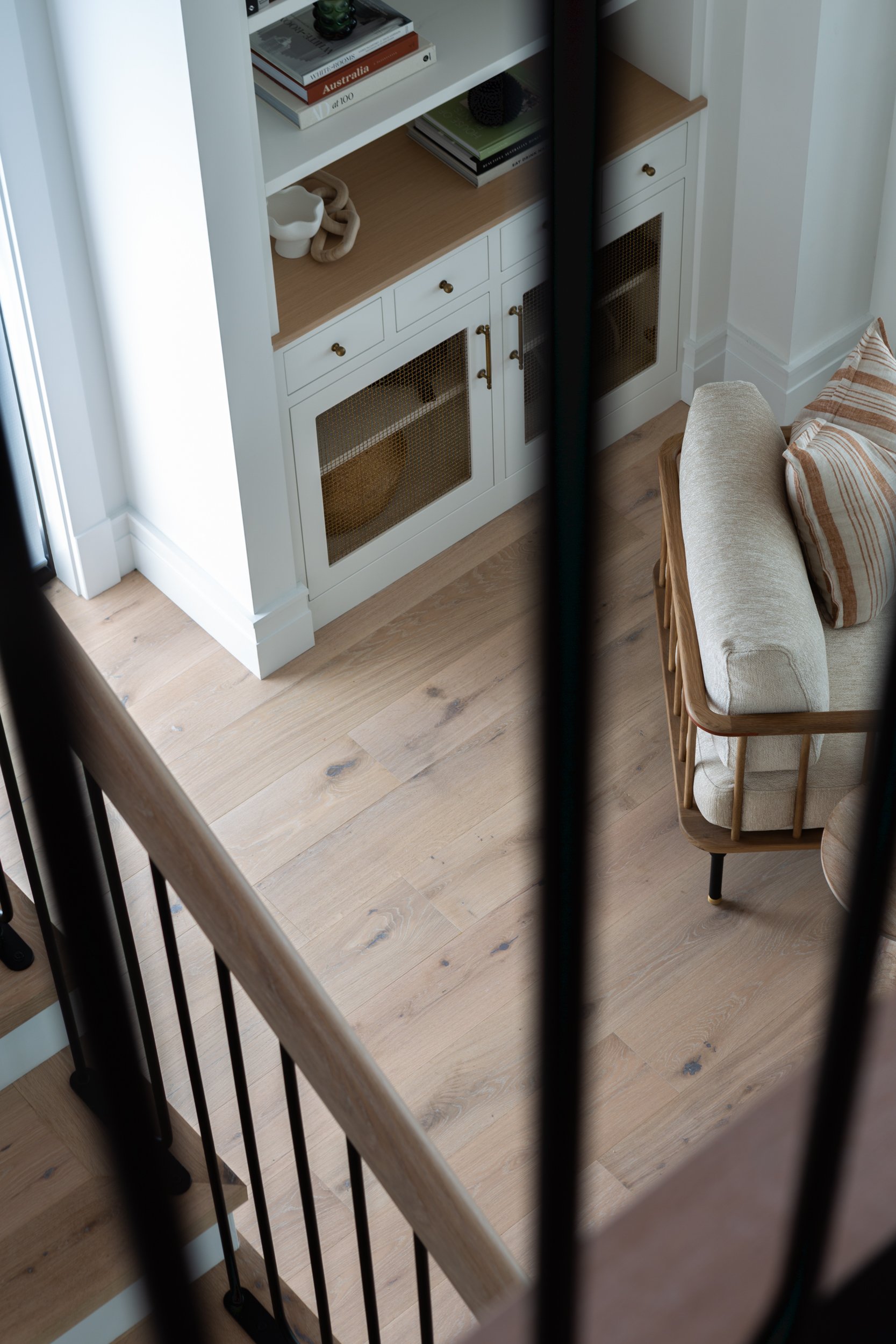 Soft whites and earthy tones dominate the colour scheme, in this Wembley home promoting a calming ambiance that complements the natural materials, including Barcelona oak flooring from the Coswick Series, used throughout the home.