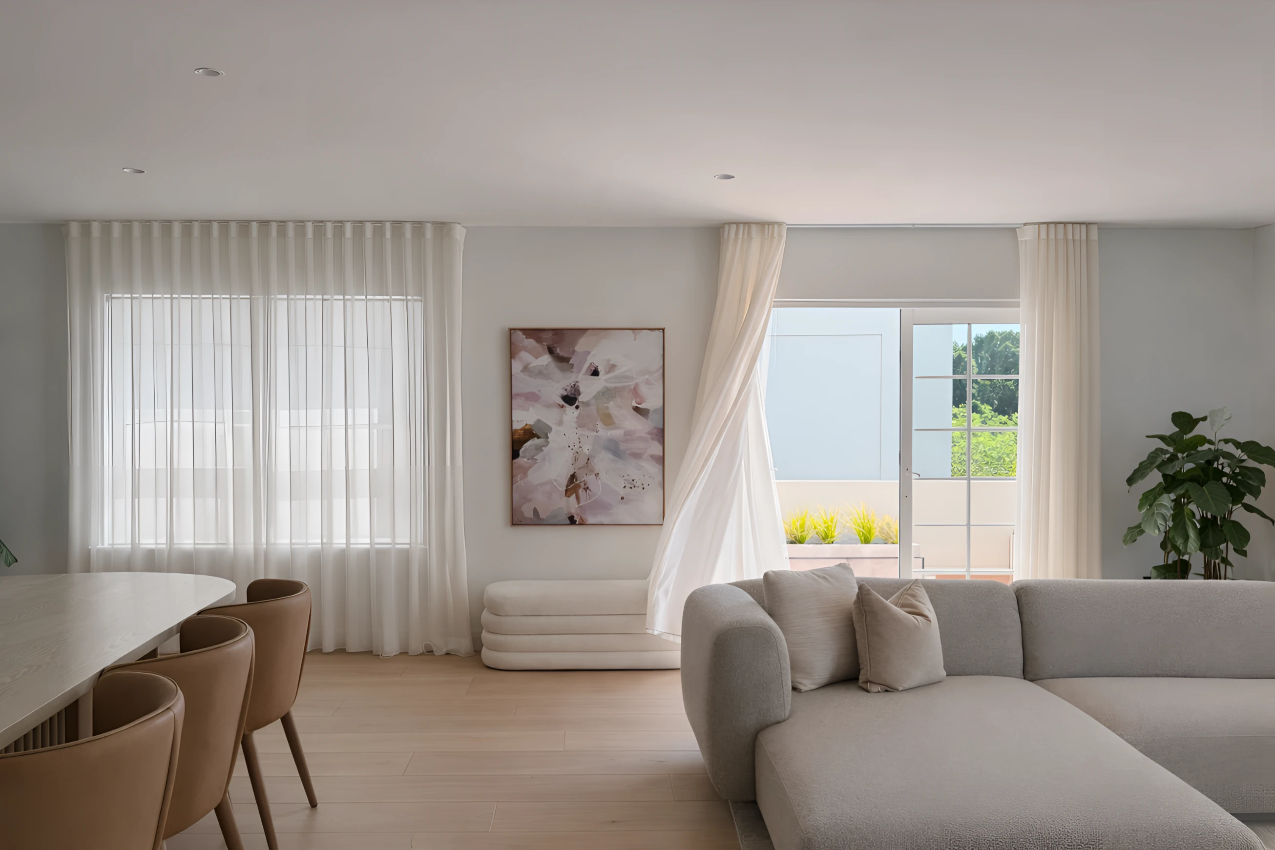 This West Perth home embraces soft minimalism with sweeping curves, calming tonal layers and a beautifully cohesive palette — all grounded by Select Grade oak flooring in Apollo. The gentle warmth of the timber enhances every space, adding quiet luxury from the entryway to the open‑plan living.