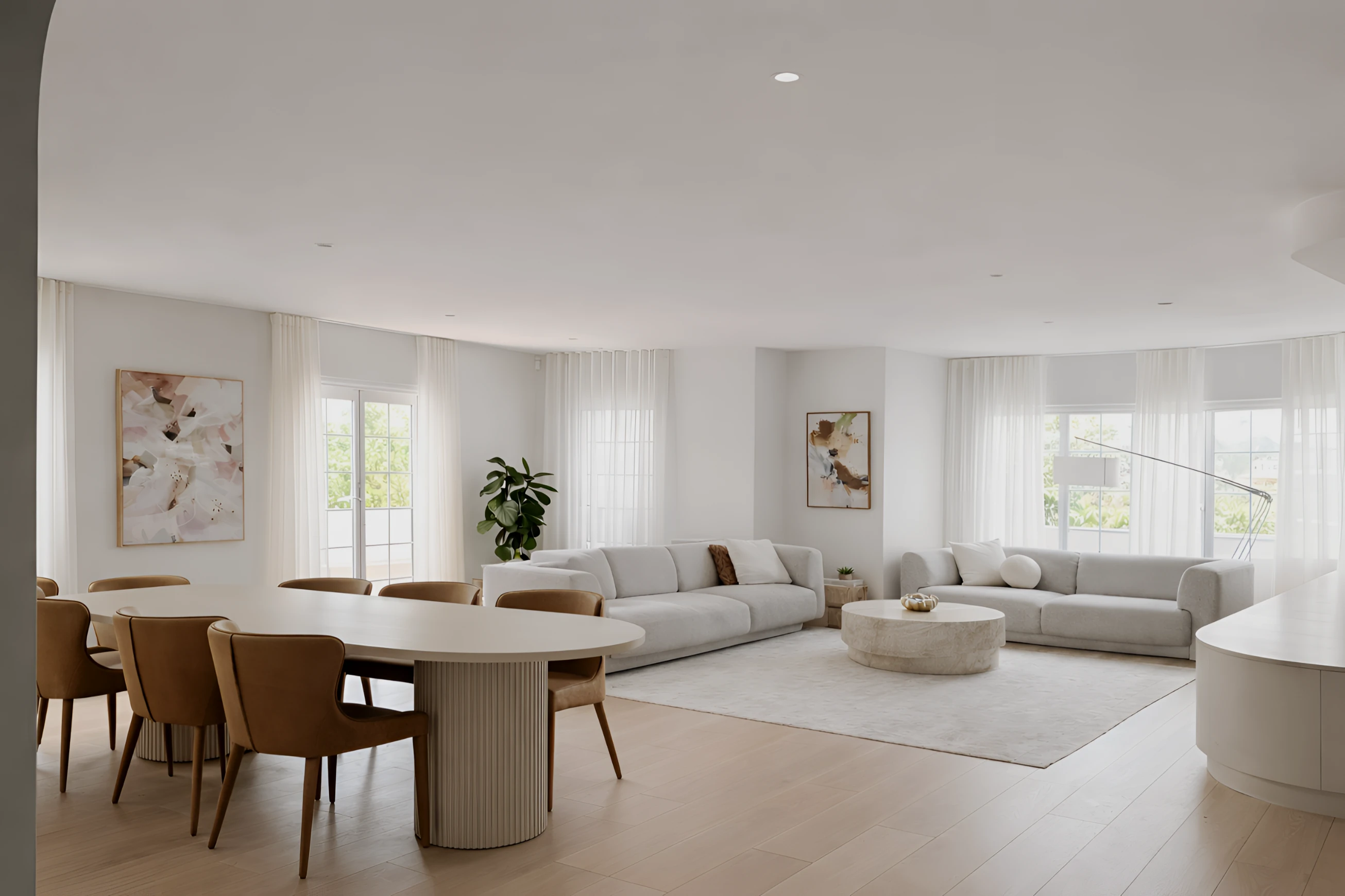 With its blend of smooth plaster finishes, organic shapes and tailored joinery, this home feels like a true modern sanctuary. The select grade oak in Apollo anchors the interior with warmth and sophistication, allowing the neutral furnishings and earthy accents to shine.